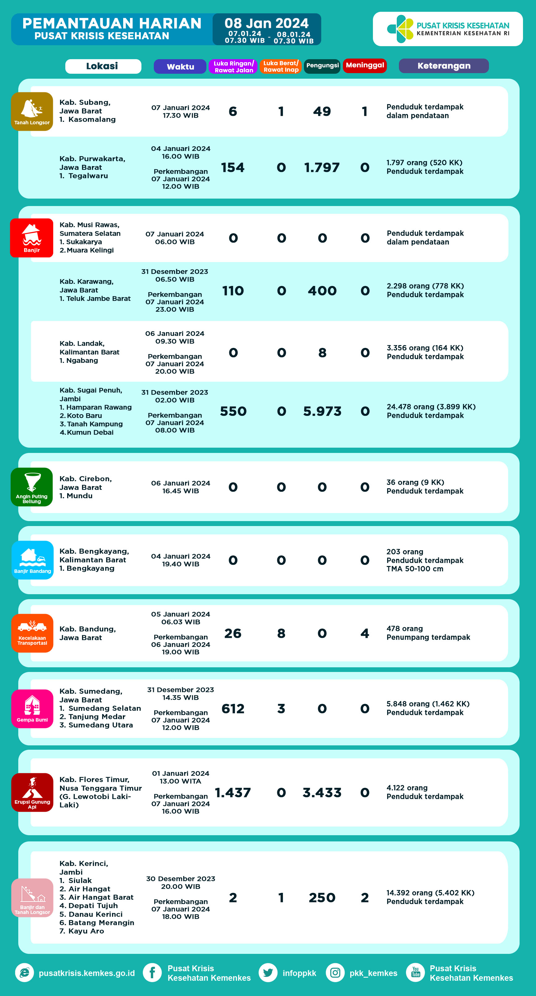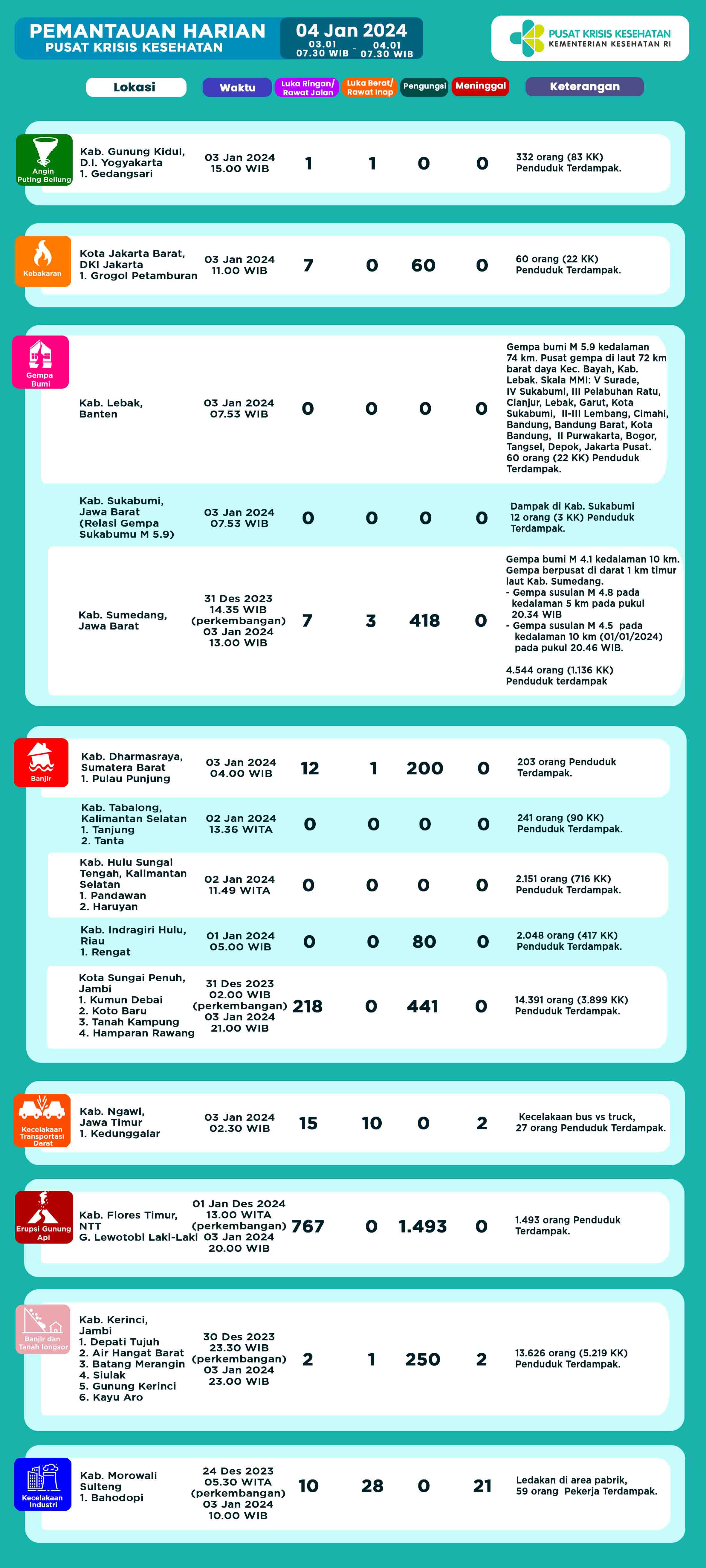 Disini anda dapat mengunduh Laporan Pemantauan Harian Kejadian Krisis Kesehatan Pusat Krisis Kesehatan Kementerian Kesehatan tanggal 31 Desember 2023 pukul 07.30 WIB hingga 01 Januari 2023 pukul 07.30 WIB. Terdapat 10 laporan kejadian: ..
