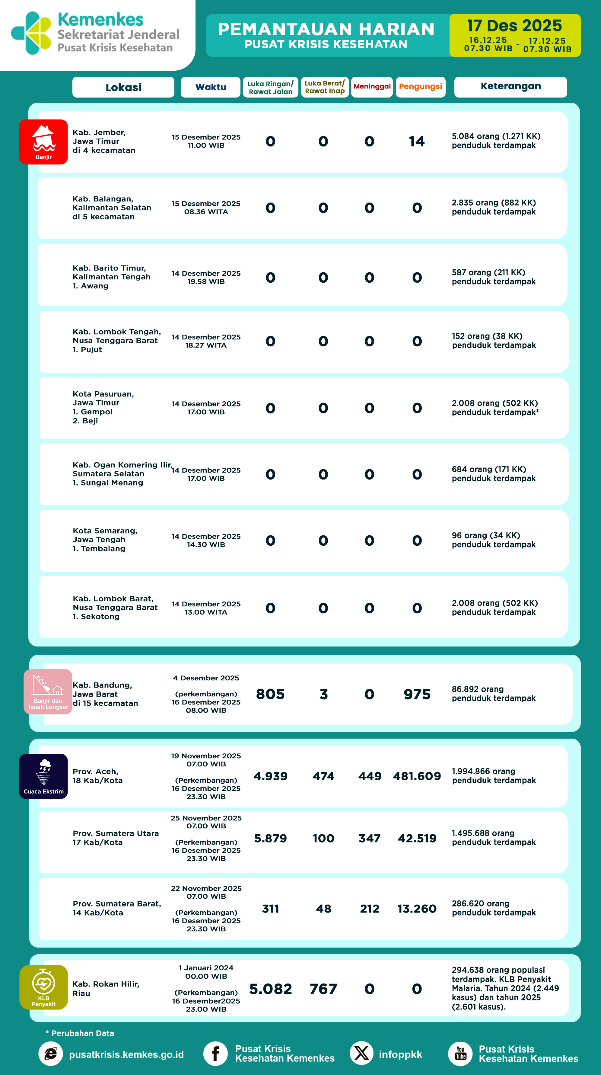 Disini anda dapat mengunduh Infografis Banjir dan Tanah Longsor di Kabupaten Mandailing Natal Provinsi Sumatera Utara, tanggal 23 Desember 2021 pukul 07.30 WIB. Akibat dari kejadian Banjir dan Tanah Longsor di Kabupaten Mandailing Natal Provinsi Sumatera Utara, tanggal 17 Desember 2021 pukul 23.30 WIB terdapat penduduk terdampak sebanyak 9.184 orang, luka berat/rawat jalan sebanyak 208 orang dan jumlah pengungsi sebanyak 4.125 orang serta korban hilang sebanyak 1 orang. Bupati Kabupaten Mandailing Natal telah menetapkan Tanggap Darurat Bencana dengan SK Nomor 360/0947/K/2021 terhitung mulai tanggal 18 Desember 2021 s.d 31 Desember 2021.