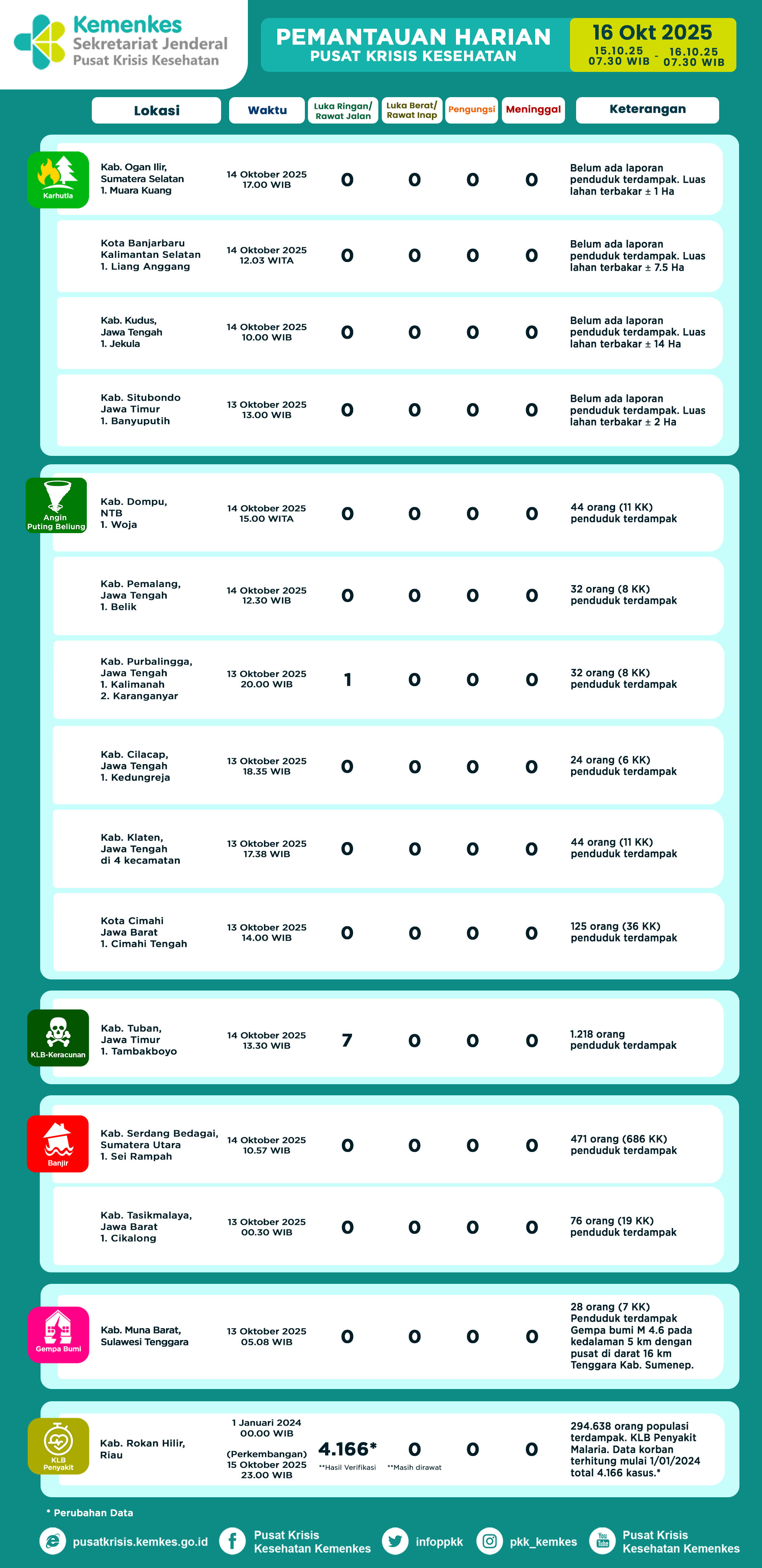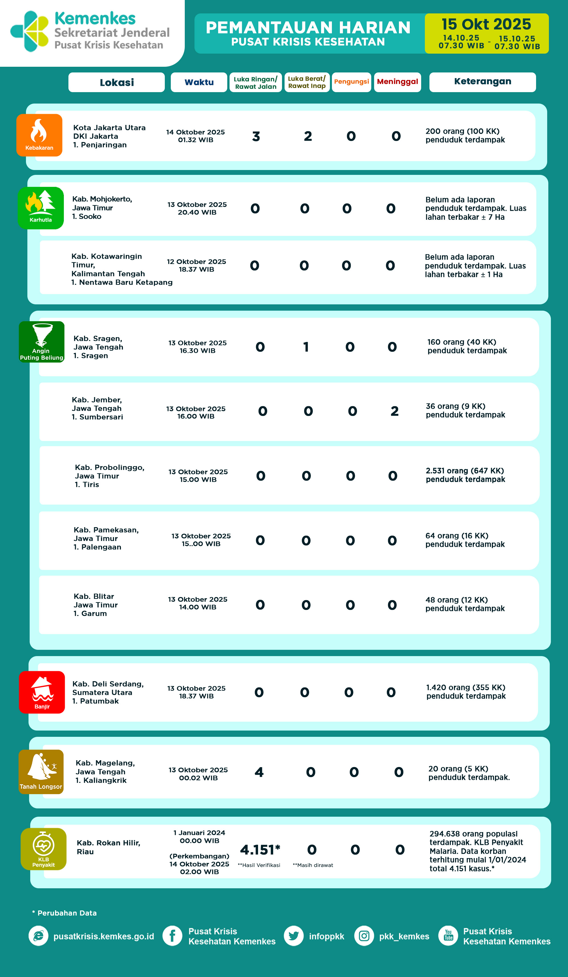 Disini anda dapat mengunduh Laporan Pemantauan Harian Kejadian Krisis Kesehatan Pusat Krisis Kesehatan Kementerian Kesehatan tanggal 04 Januari 2024 pukul 07.30 WIB hingga 05 Januari 2024 pukul 07.30 WIB. Terdapat 10 laporan kejadian: 2 angin puting beliung, 2 gempa bumi, 4 banjir, 1 erupsi gunung lewotobi laki-laki, 1 banjir dan tanah longsor