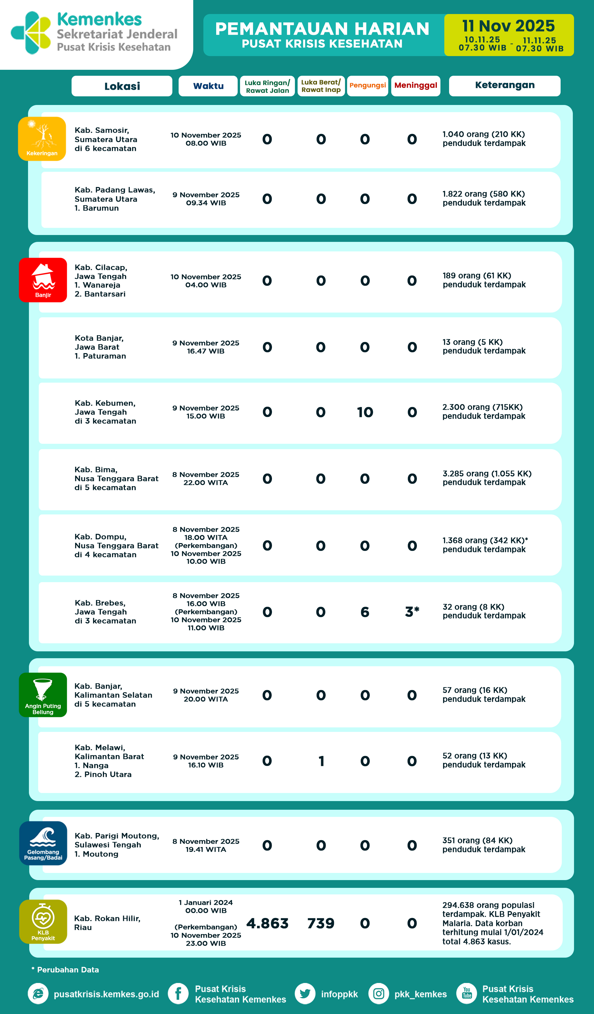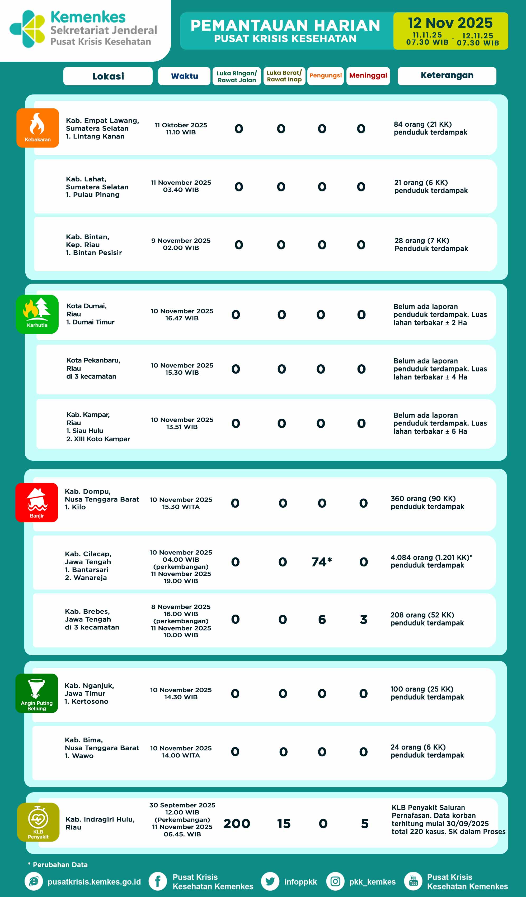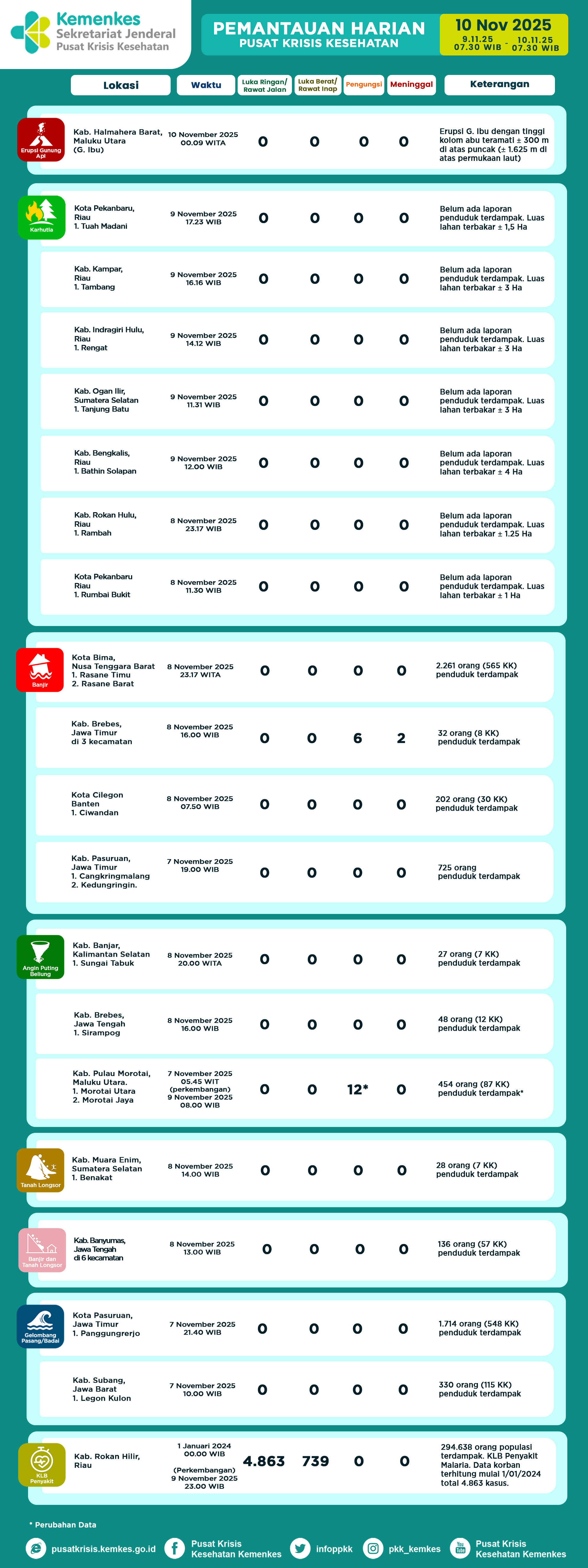 Disini anda dapat mengunduh Laporan Pemantauan Harian Kejadian Krisis Kesehatan Pusat Krisis Kesehatan Kementerian Kesehatan tanggal 04 Juni 2024 pukul 07.30 WIB hingga 05 Juni 2024 pukul 07.30 WIB. Terdapat 10 laporan kejadian bencana: 1 Banjir dan Tanah Longsor, 5 Banjir, 2 Banjir Bandang dan 2 Erupsi Gunung
