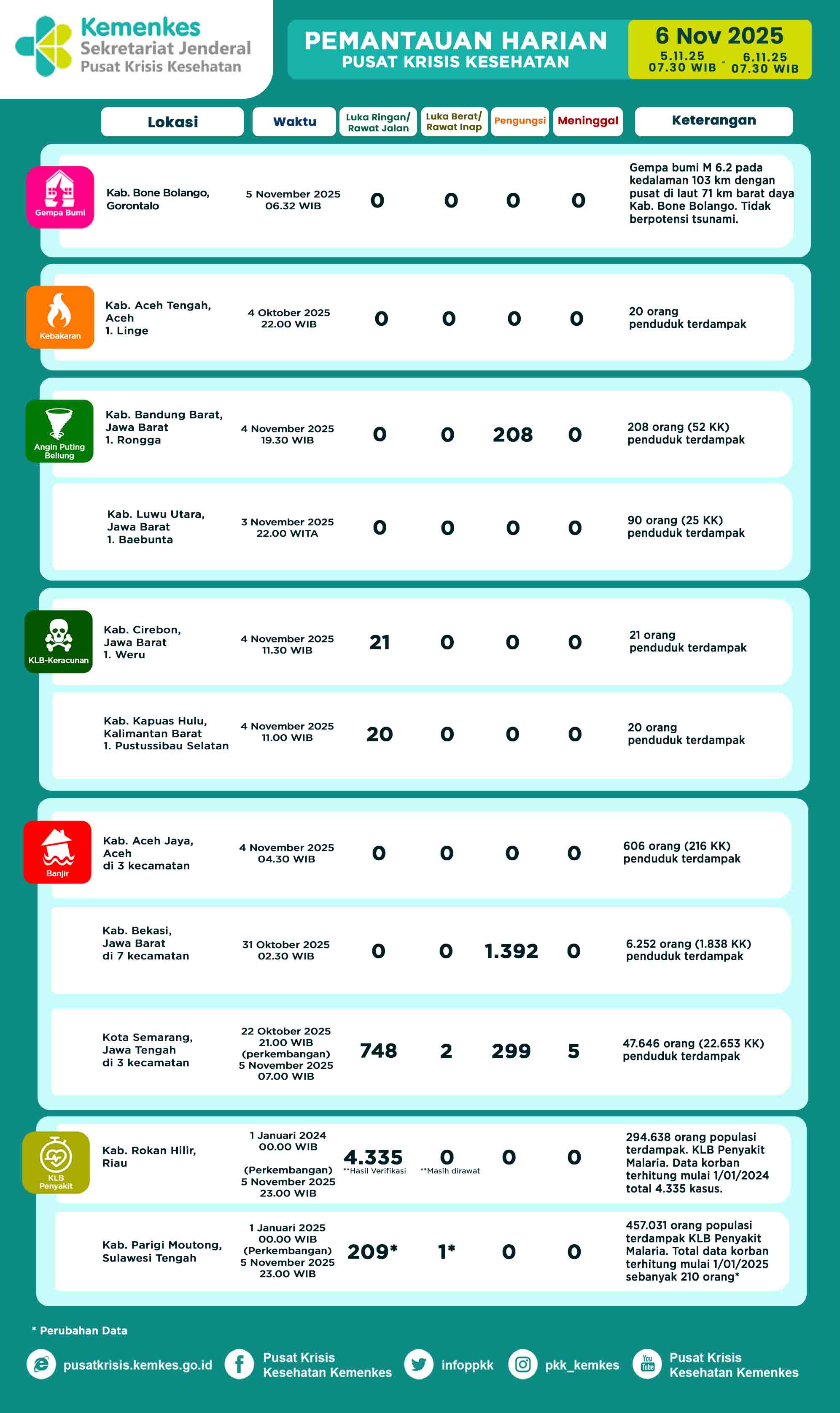 Disini anda dapat mengunduh Laporan Pemantauan Harian Kejadian Krisis Kesehatan Pusat Krisis Kesehatan Kementerian Kesehatan tanggal 08 Januari 2024 pukul 07.30 WIB hingga 09 Januari 2024 pukul 07.30 WIB. Terdapat 12 laporan kejadian: 3 Gempa bumi, 3 Banjir, 2 Angin Puting Beliung, 1 Tanah Longsor, , 1 Kecelakaan Transportasi Darat, 1 Erupsi Gunung Berapi, 1 Banjir dan Tanah Longsor