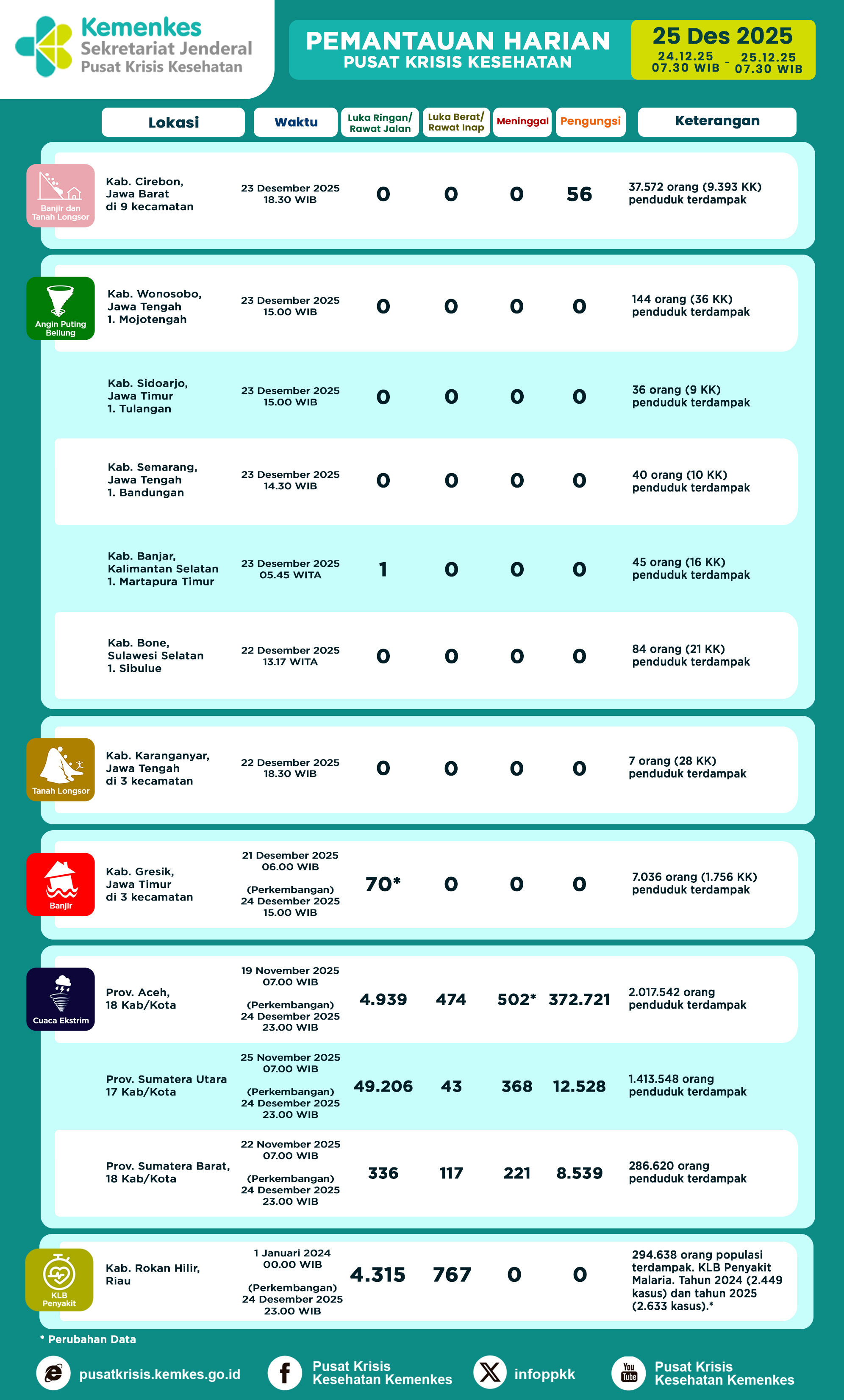 Disini anda dapat mengunduh Laporan Pemantauan Harian Kejadian Krisis Kesehatan Pusat Krisis Kesehatan Kementerian Kesehatan tanggal 09 Februari 2024 pukul 07.30 WIB hingga 10 Februari 2024 pukul 07.30 WIB. Terdapat 8 kejadian bencana: 1 Gempa bumi, 5 Banjir, 1 Banjir Bandang, 1 Kebakaran.