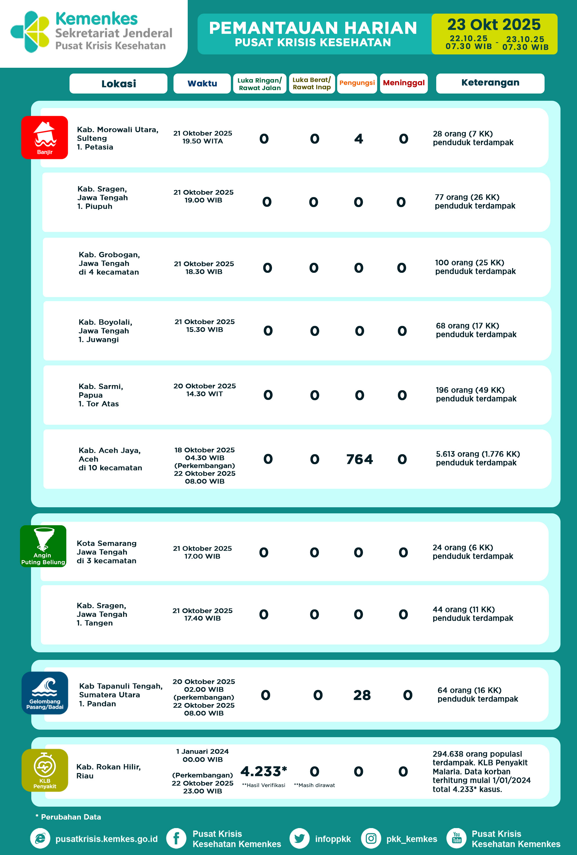 Disini anda dapat mengunduh Laporan Pemantauan Harian Kejadian Krisis Kesehatan Pusat Krisis Kesehatan Kementerian Kesehatan tanggal 12 Januari 2024 pukul 07.30 WIB hingga 13 Januari 2024 pukul 07.30 WIB. Terdapat 7 laporan kejadian: 3 Angin Puting Beliung, 2 Banjir, 1 Erupsi Gunung Api, dan 1 Banjir dan Tanah Longsor.