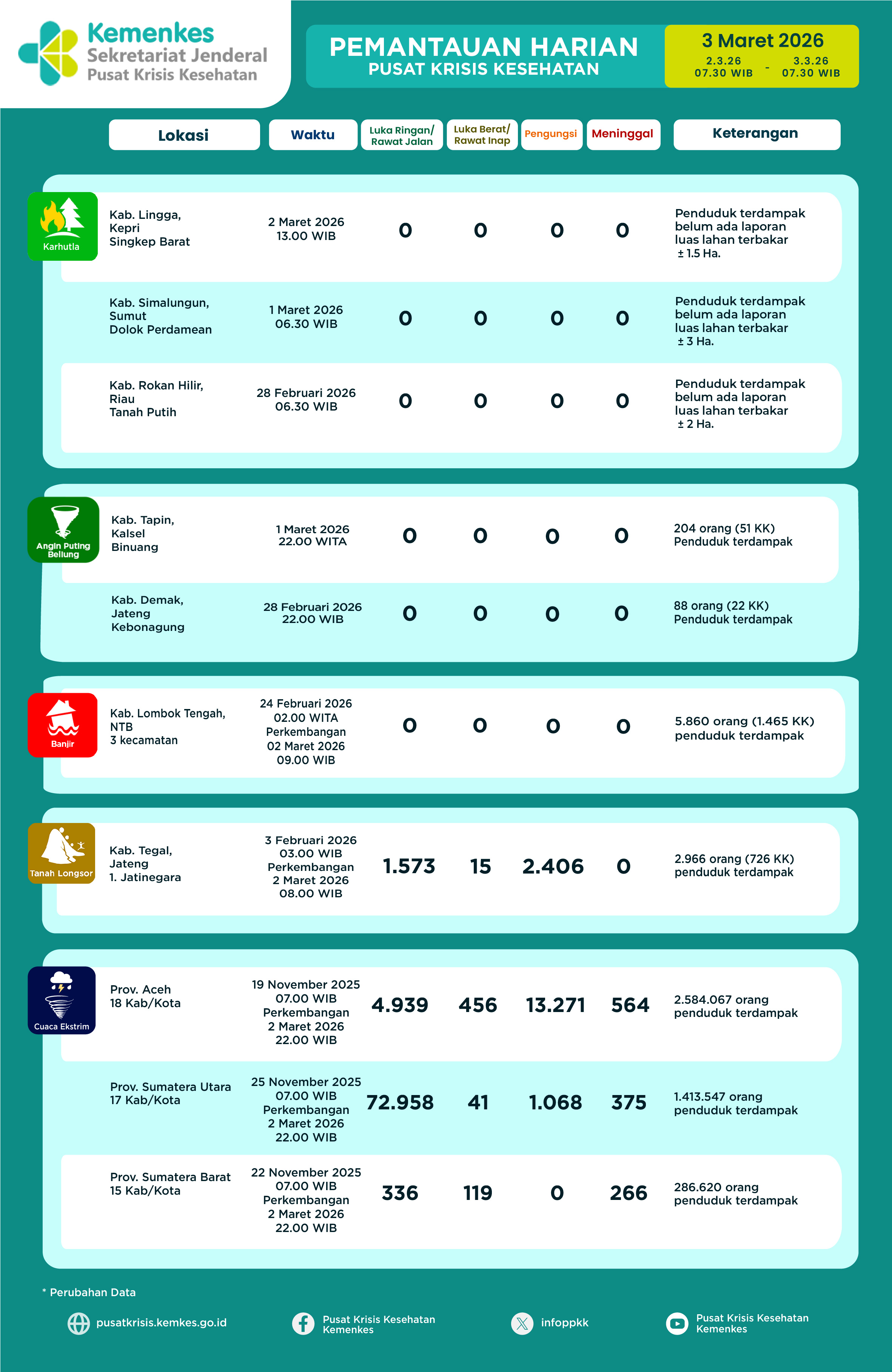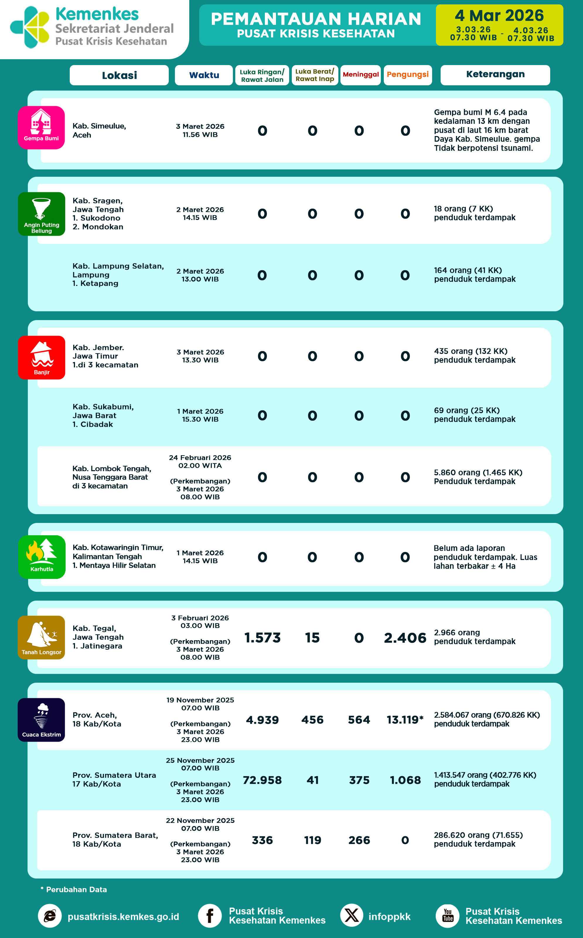 Disini anda dapat mengunduh Laporan Pemantauan Harian Kejadian Krisis Kesehatan Pusat Krisis Kesehatan Kementerian Kesehatan tanggal 11 September 2024 pukul 07.30 WIB hingga 12 September 2024 pukul 07.30 WIB. Terdapat 10 laporan kejadian bencana: 5 Kebakaran Hutan dan Lahan, 1 Angin Puting Beliung, 1 Banjir Bandang, 2 Kekeringan, 1 Keracunan, 1 Banjir dan Tanah Longsor, dan 1 KLB Penyakit