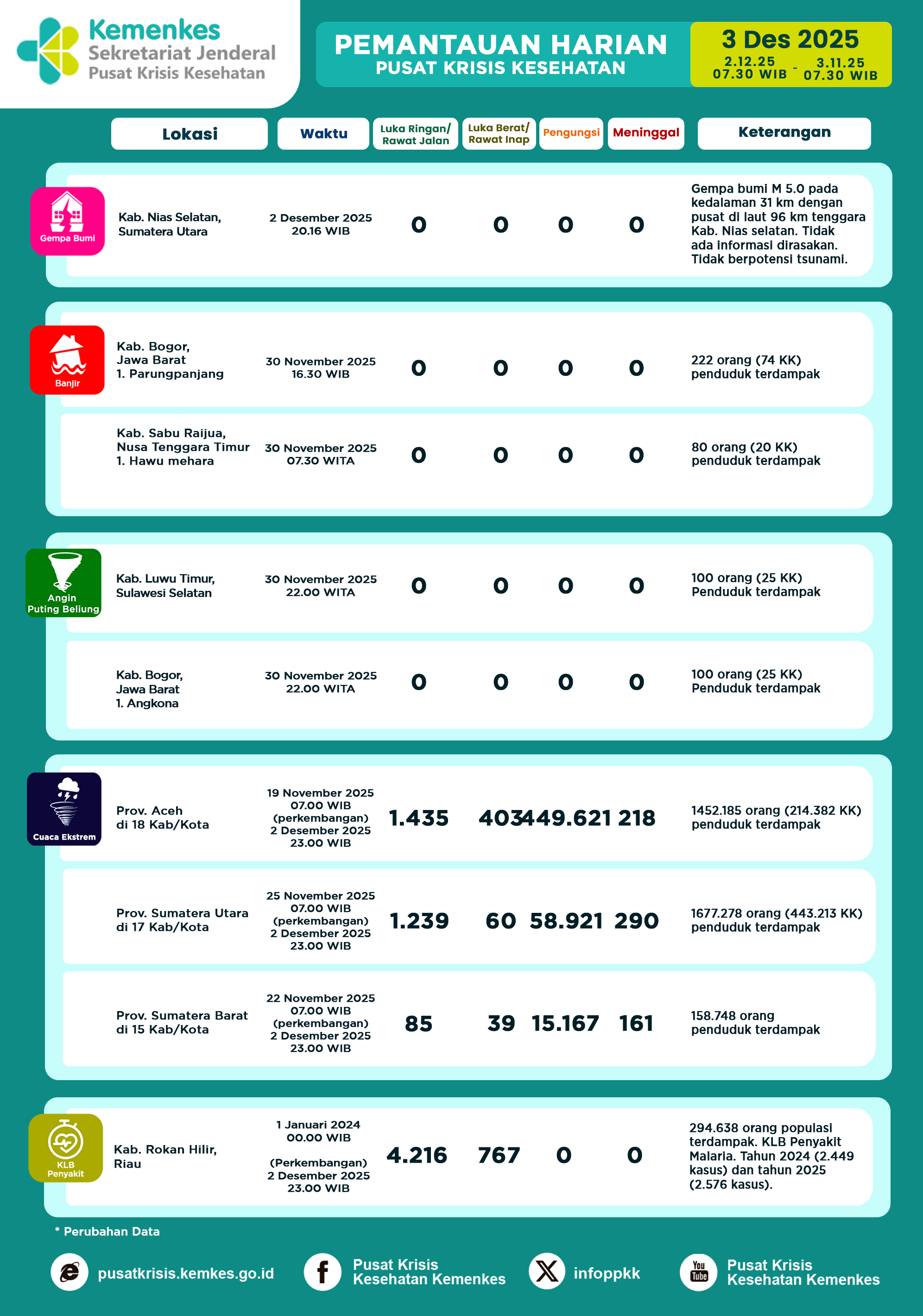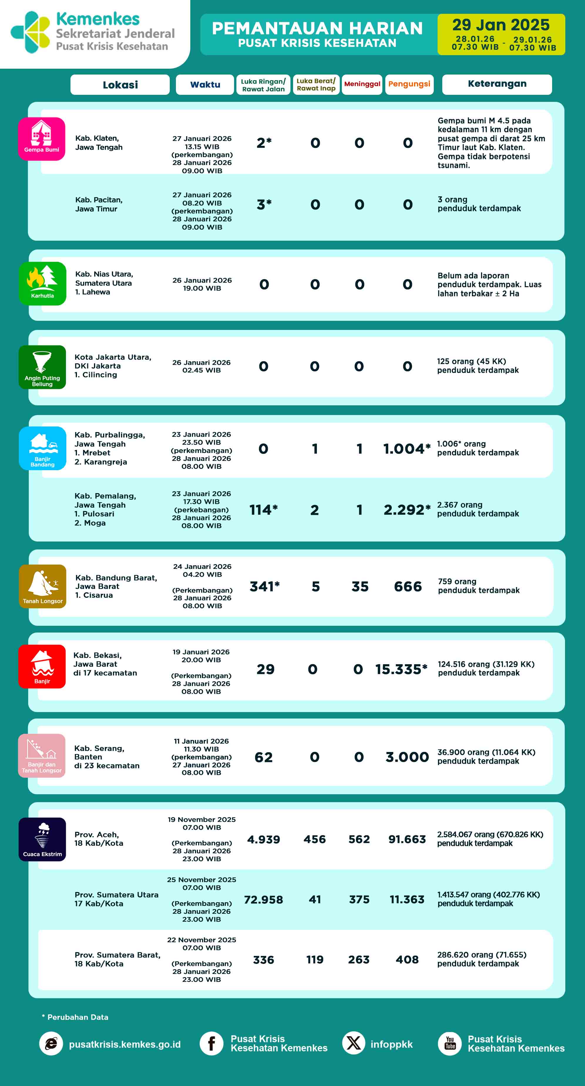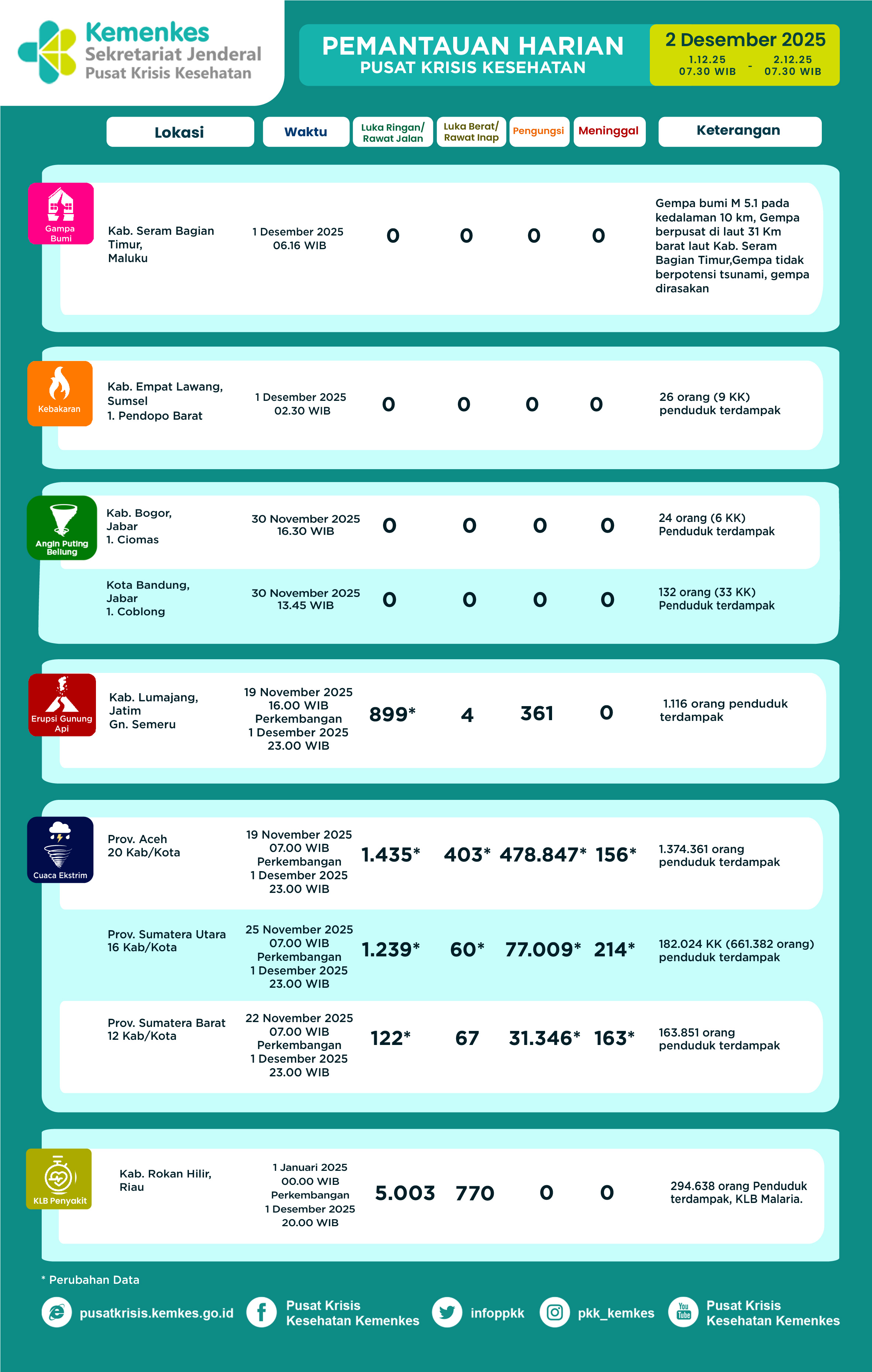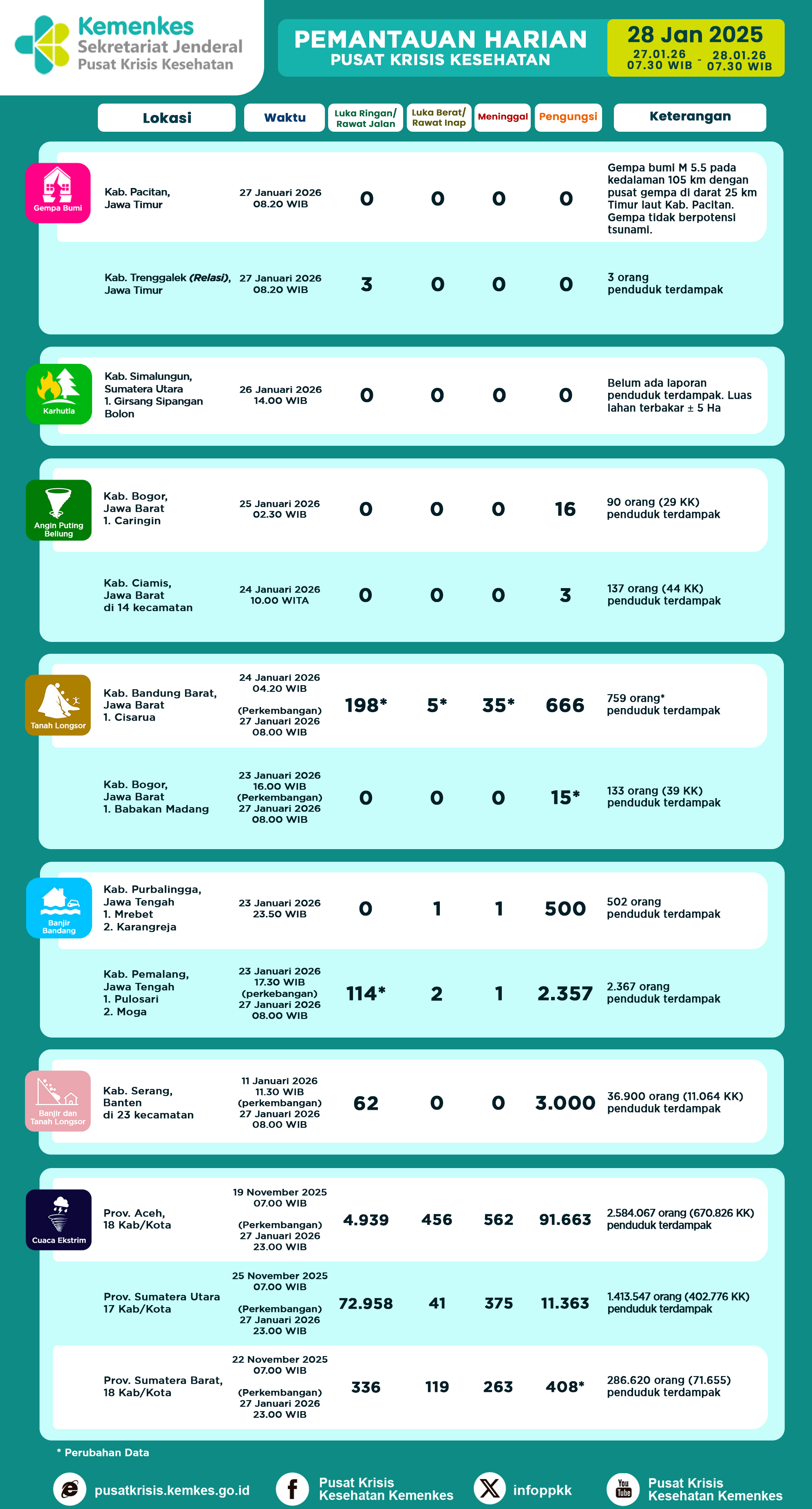 Disini anda dapat mengunduh Laporan Pemantauan Harian Kejadian Krisis Kesehatan Pusat Krisis Kesehatan Kementerian Kesehatan tanggal 13 Juli 2024 pukul 07.30 WIB hingga 14 Juli 2024 pukul 07.30 WIB. Terdapat 11 laporan kejadian bencana: 1 Gempa Bumi, 3 Banjir, 3 Banjir dan Tanah Longsor, 1 Kecelakaan trasnportasi Darat, 1 Kebakaran, 1 Karhutla dan 1 Angin Puting Beliung