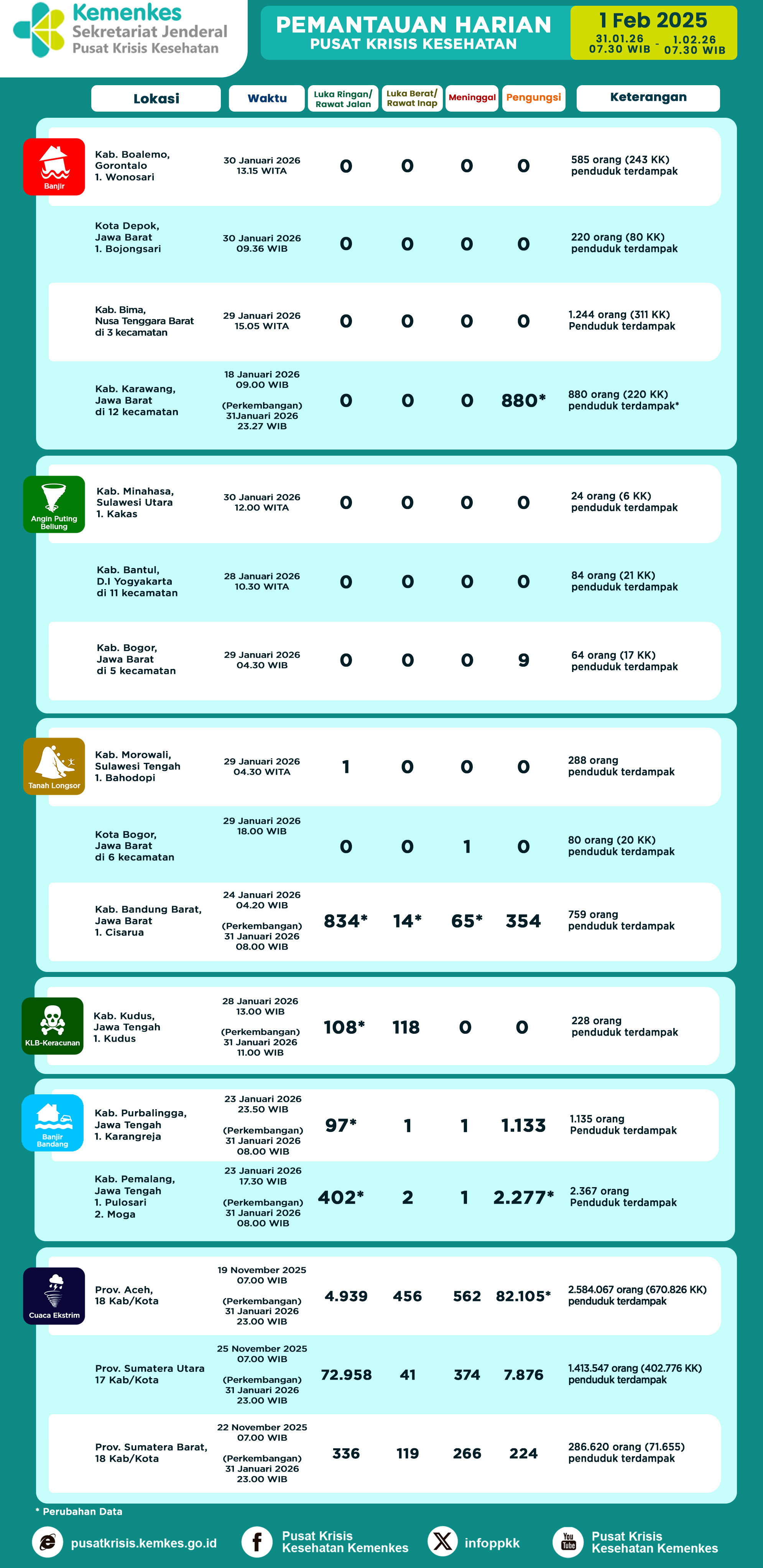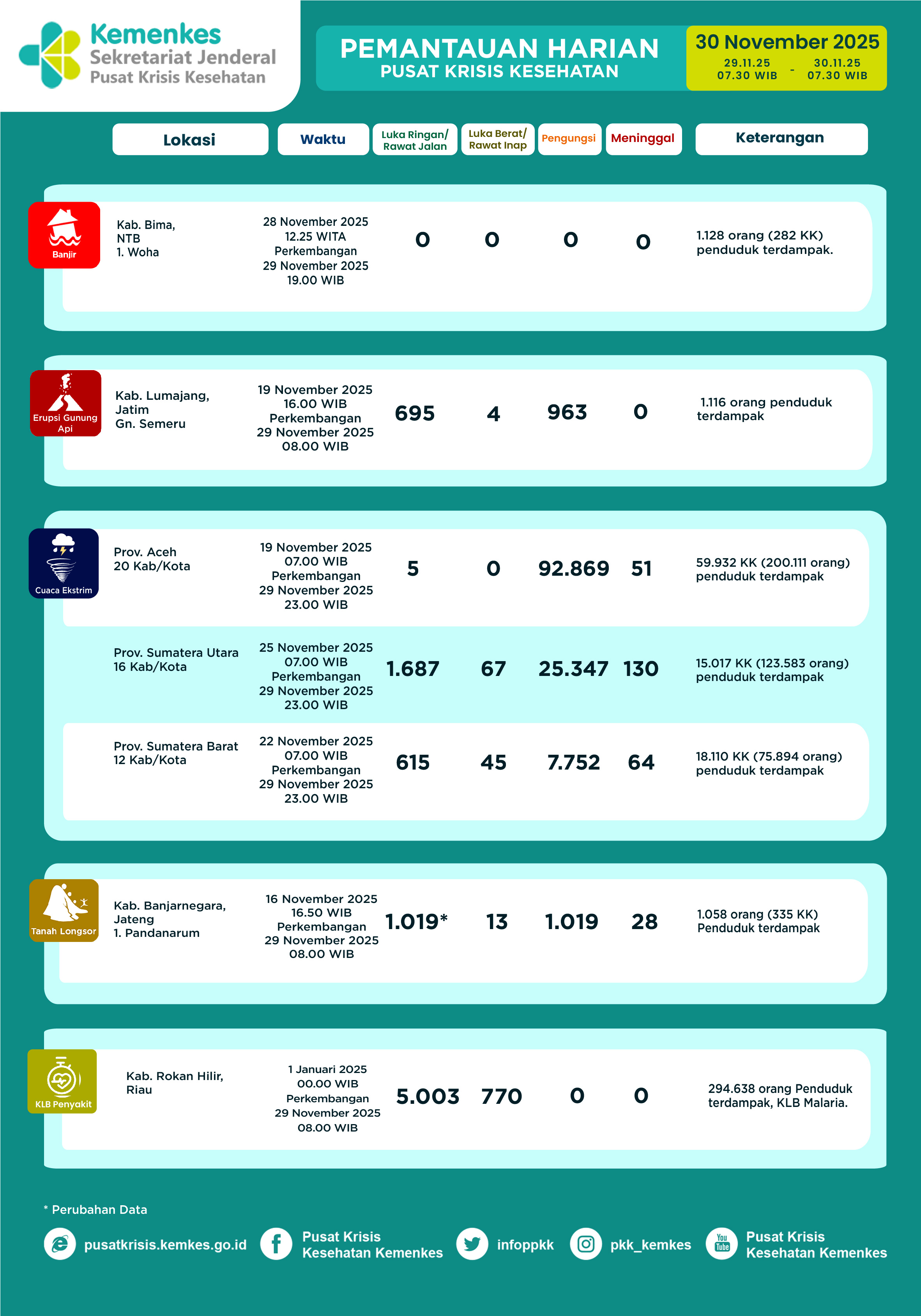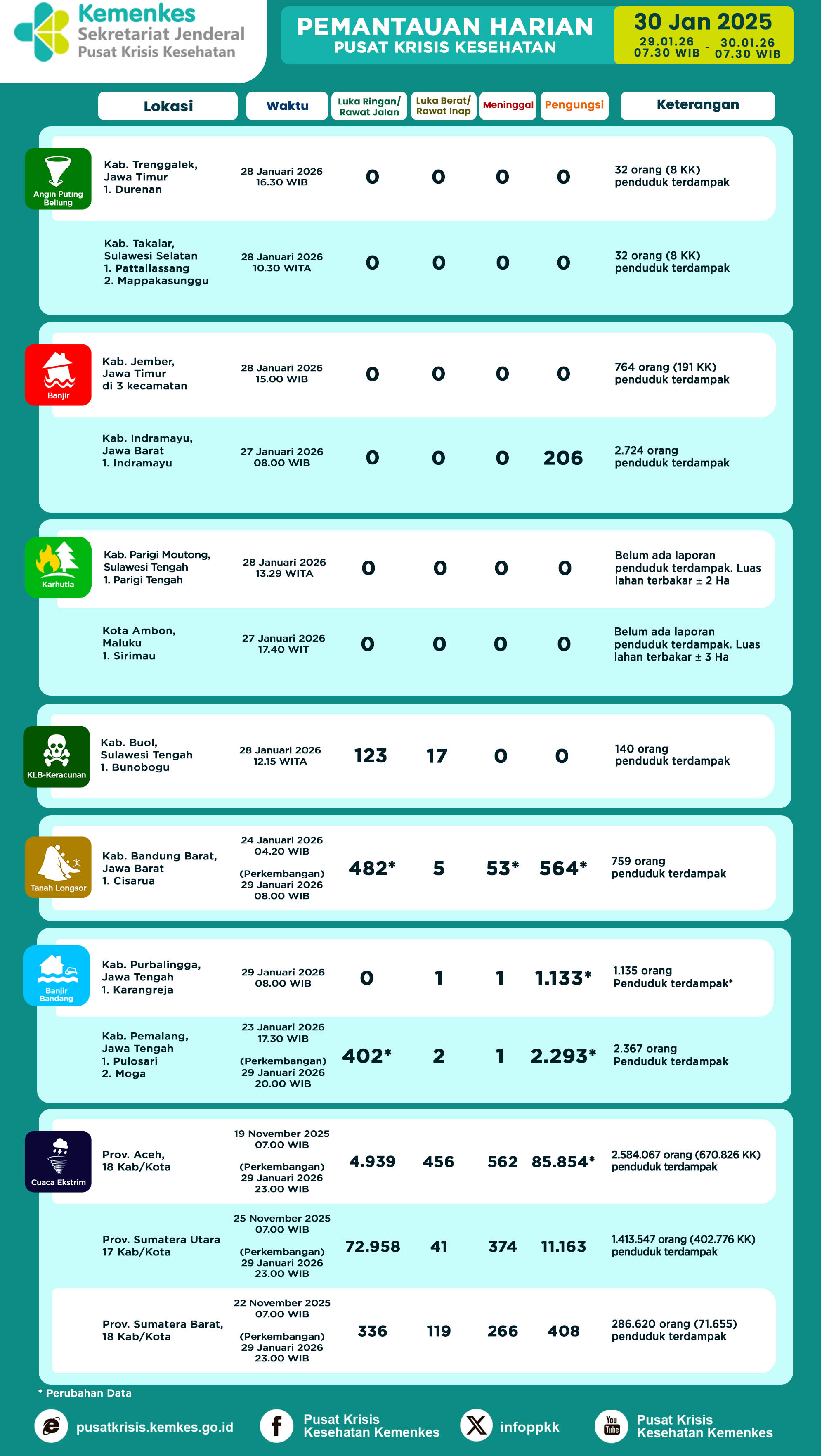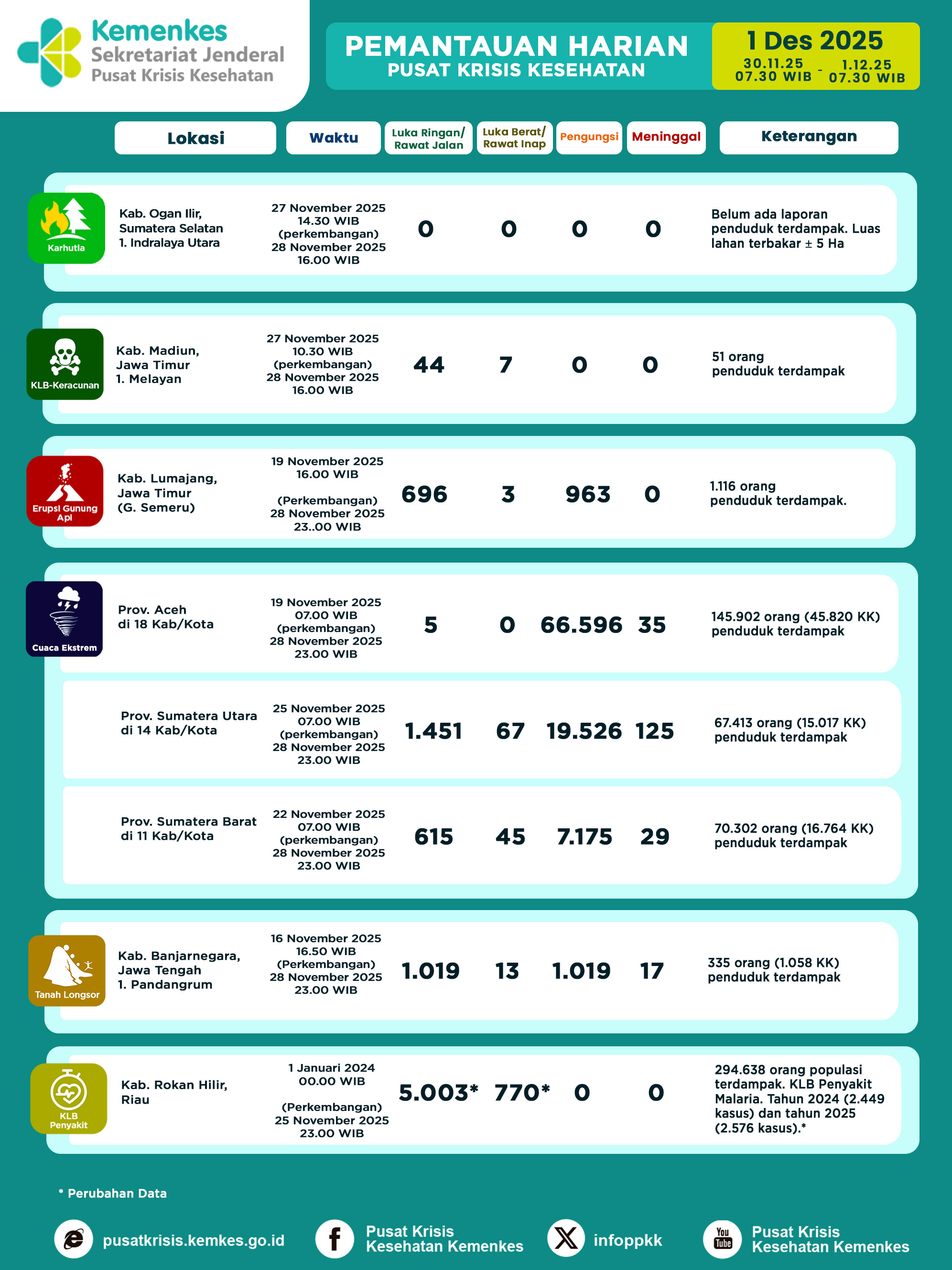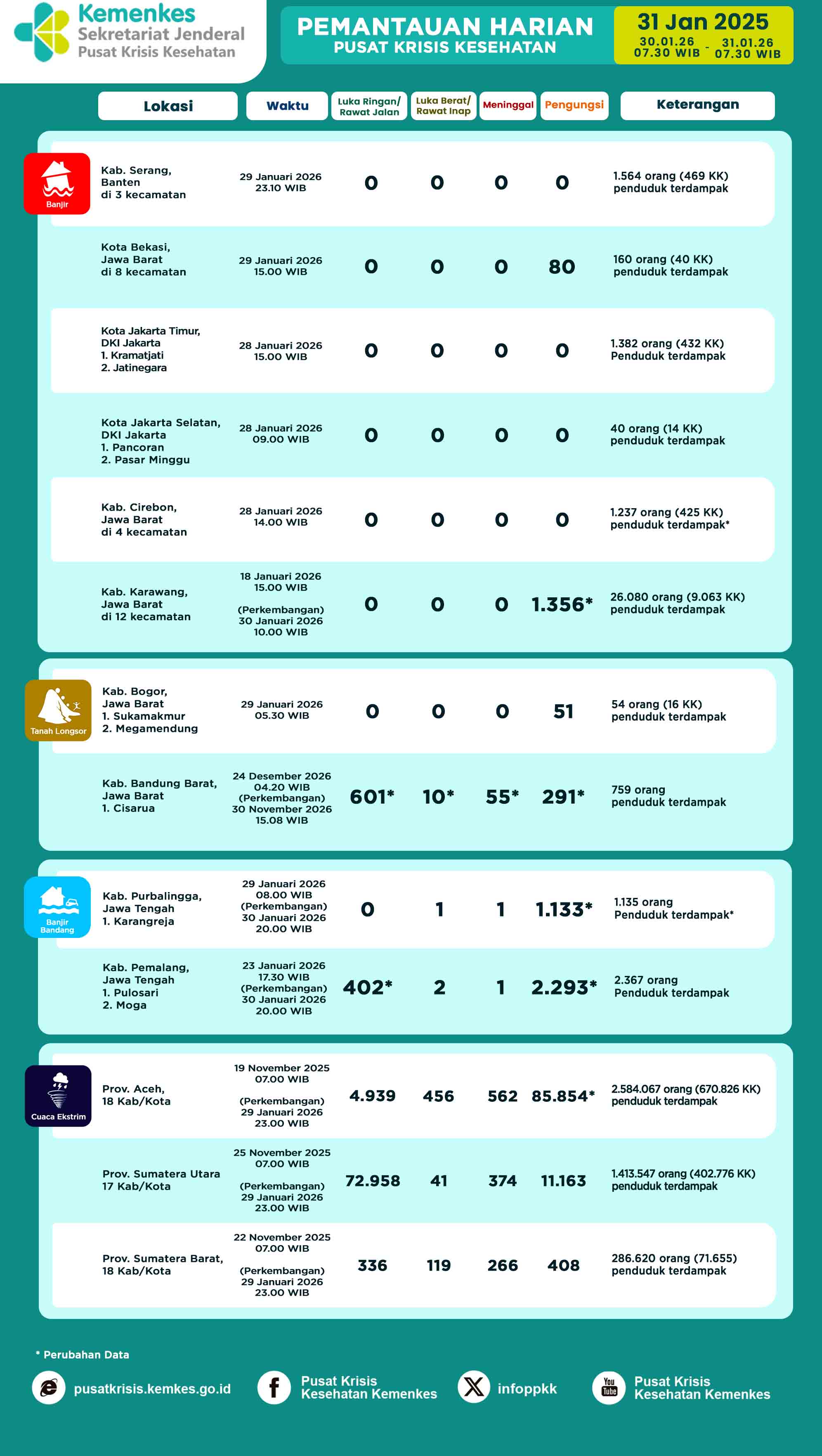 Disini anda dapat mengunduh Laporan Pemantauan Harian Kejadian Krisis Kesehatan Pusat Krisis Kesehatan Kementerian Kesehatan tanggal 13 Juli 2024 pukul 07.30 WIB hingga 14 Juli 2024 pukul 07.30 WIB. Terdapat 11 laporan kejadian bencana: 1 Gempa Bumi, 3 Banjir, 3 Banjir dan Tanah Longsor, 1 Kecelakaan trasnportasi Darat, 1 Kebakaran, 1 Karhutla dan 1 Angin Puting Beliung