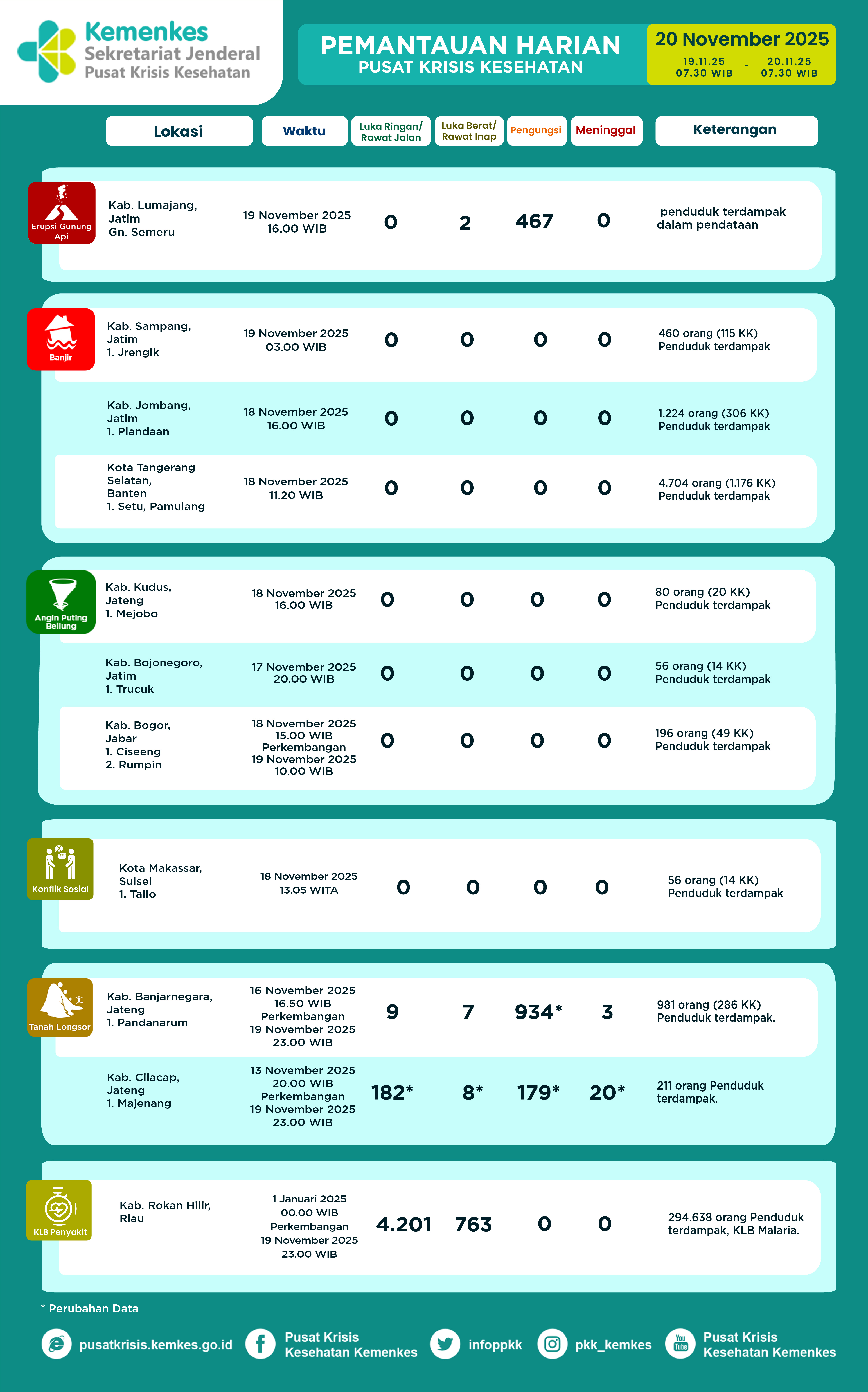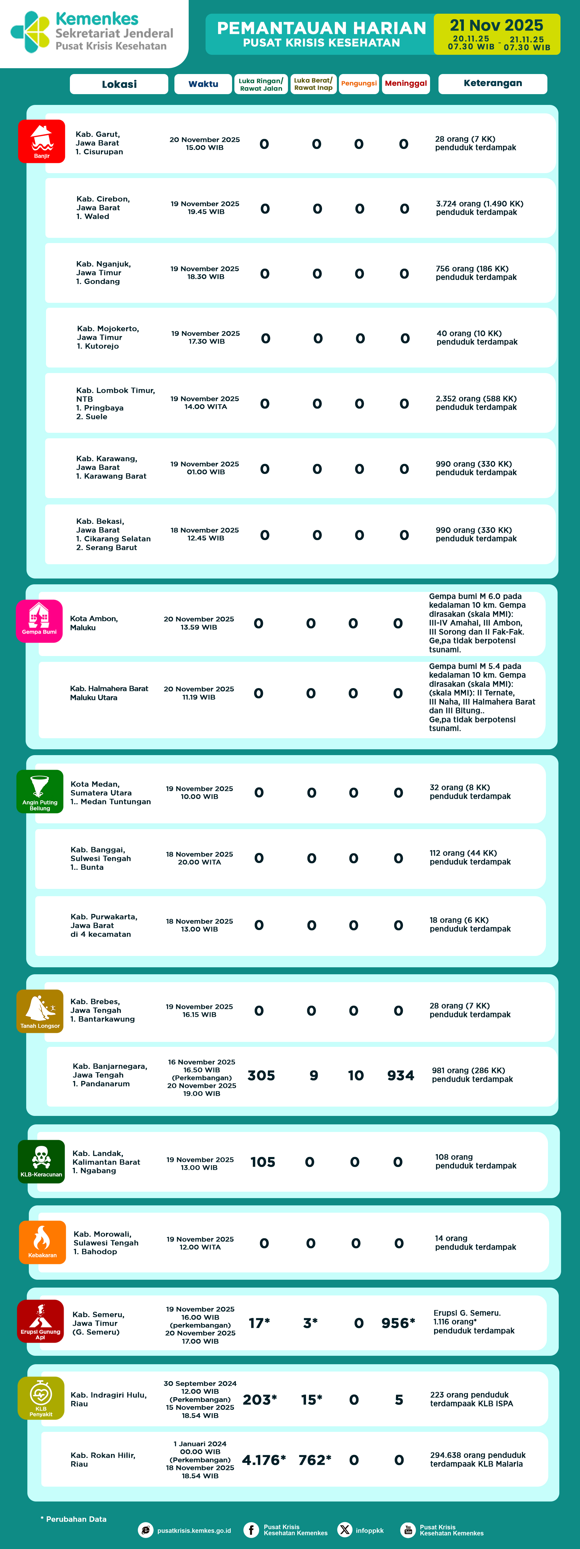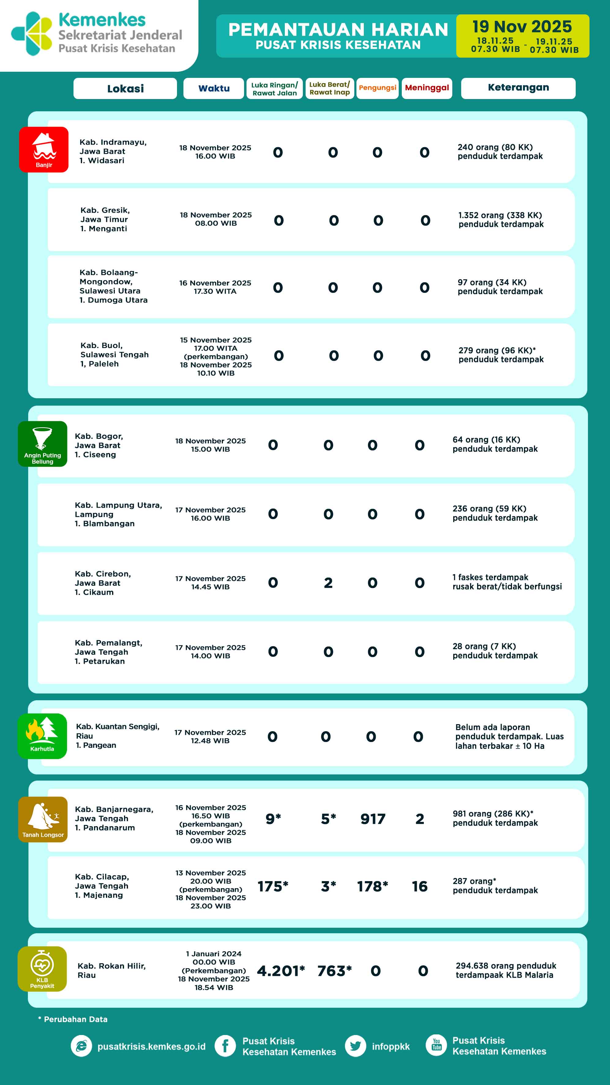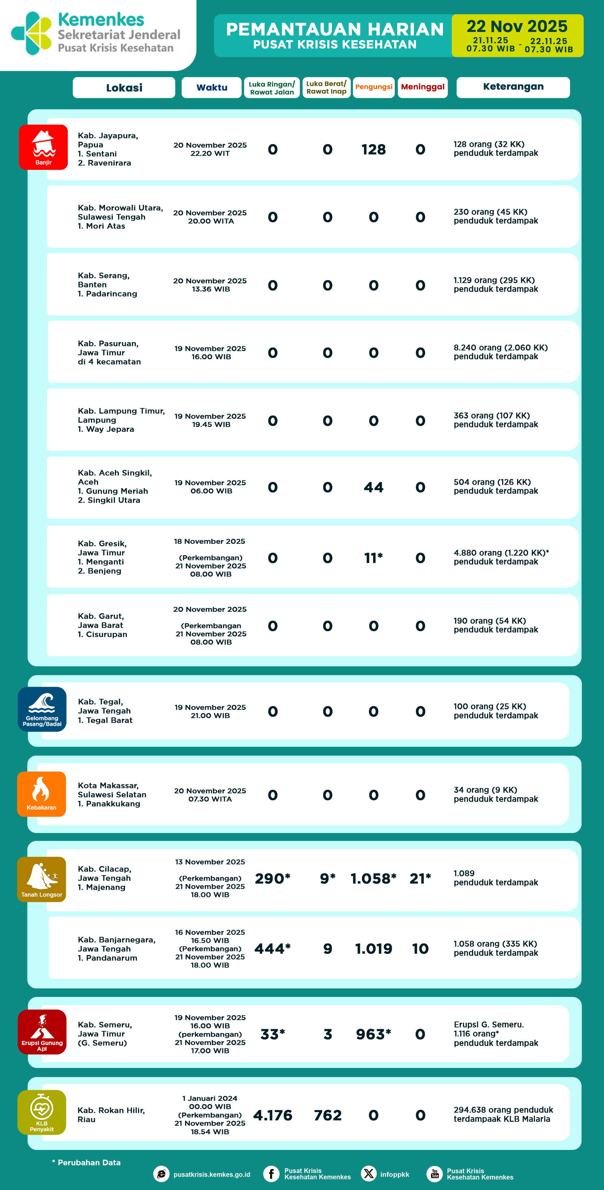 Disini anda dapat mengunduh Laporan Pemantauan Harian Kejadian Krisis Kesehatan Pusat Krisis Kesehatan Kementerian Kesehatan tanggal 14 Januari 2024 pukul 07.30 WIB hingga 15 Januari 2024 pukul 07.30 WIB. Terdapat 11 laporan kejadian: 9 Banjir, 1 Erupsi Gunung Api, 1 Banjir dan Tanah Longsor.