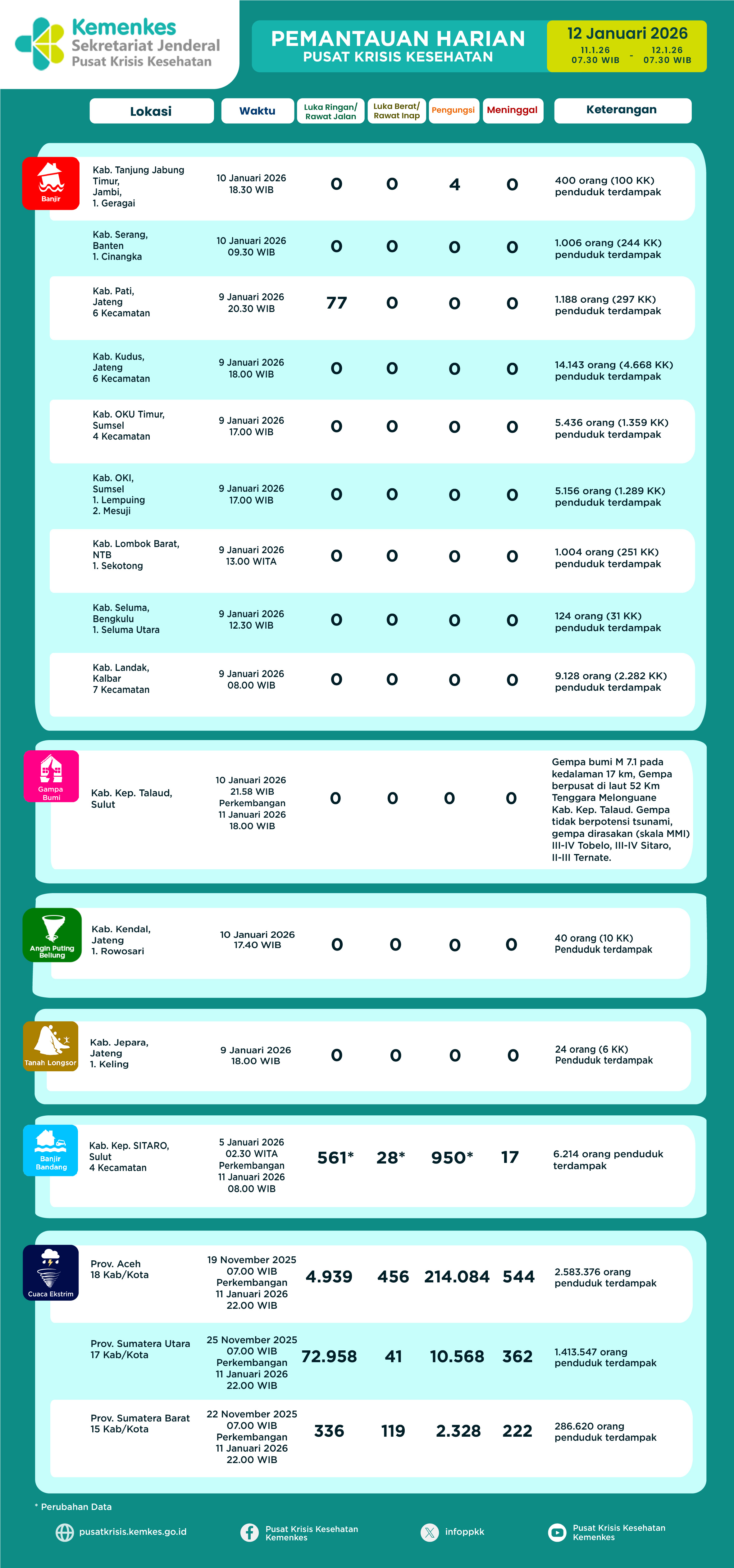 Disini anda dapat melihat dan mengunduh Laporan Pemantauan Harian Kejadian Krisis Kesehatan Pusat Krisis Kesehatan Kementerian Kesehatan tanggal 1 Mei 2025 pukul 07.30 WIB hingga 2 Mei 2025 pukul 07.30 WIB