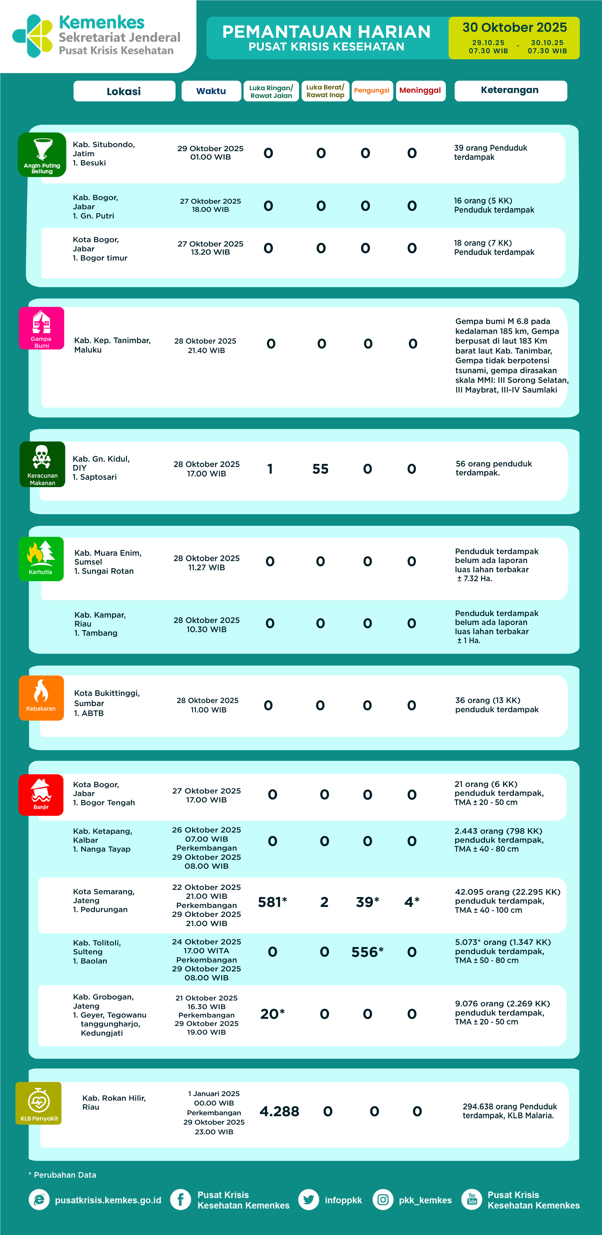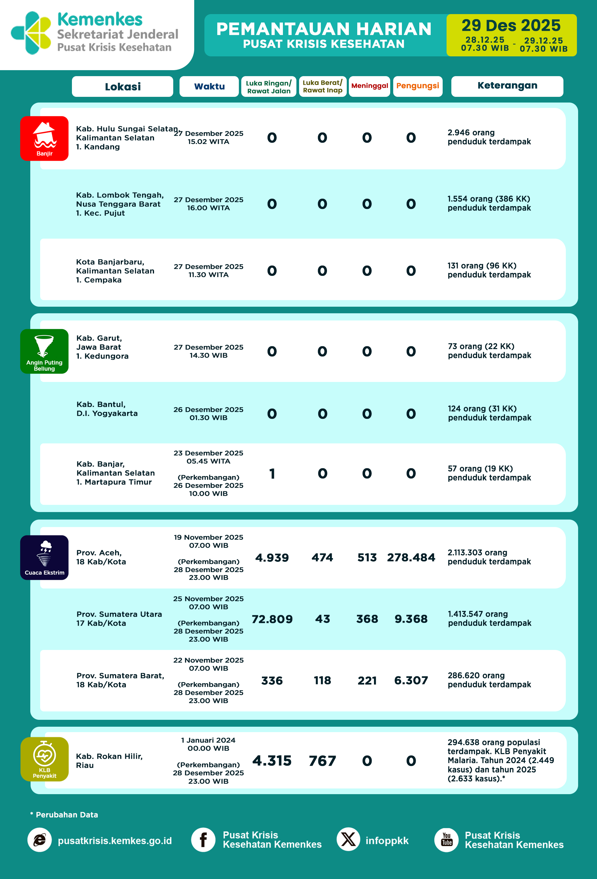 Disini anda dapat mengunduh Laporan Pemantauan Harian Kejadian Krisis Kesehatan Pusat Krisis Kesehatan Kementerian Kesehatan tanggal 19 April 2024 pukul 07.30 WIB hingga 20 April 2024 pukul 07.30 WIB. Terdapat 7 laporan kejadian bencana: 1 Kebakaran, 2 Banjir dan Tanah Longsor, 2 Banjir, 1 Erupsi Gunung, dan 1 Banjir Bandang.