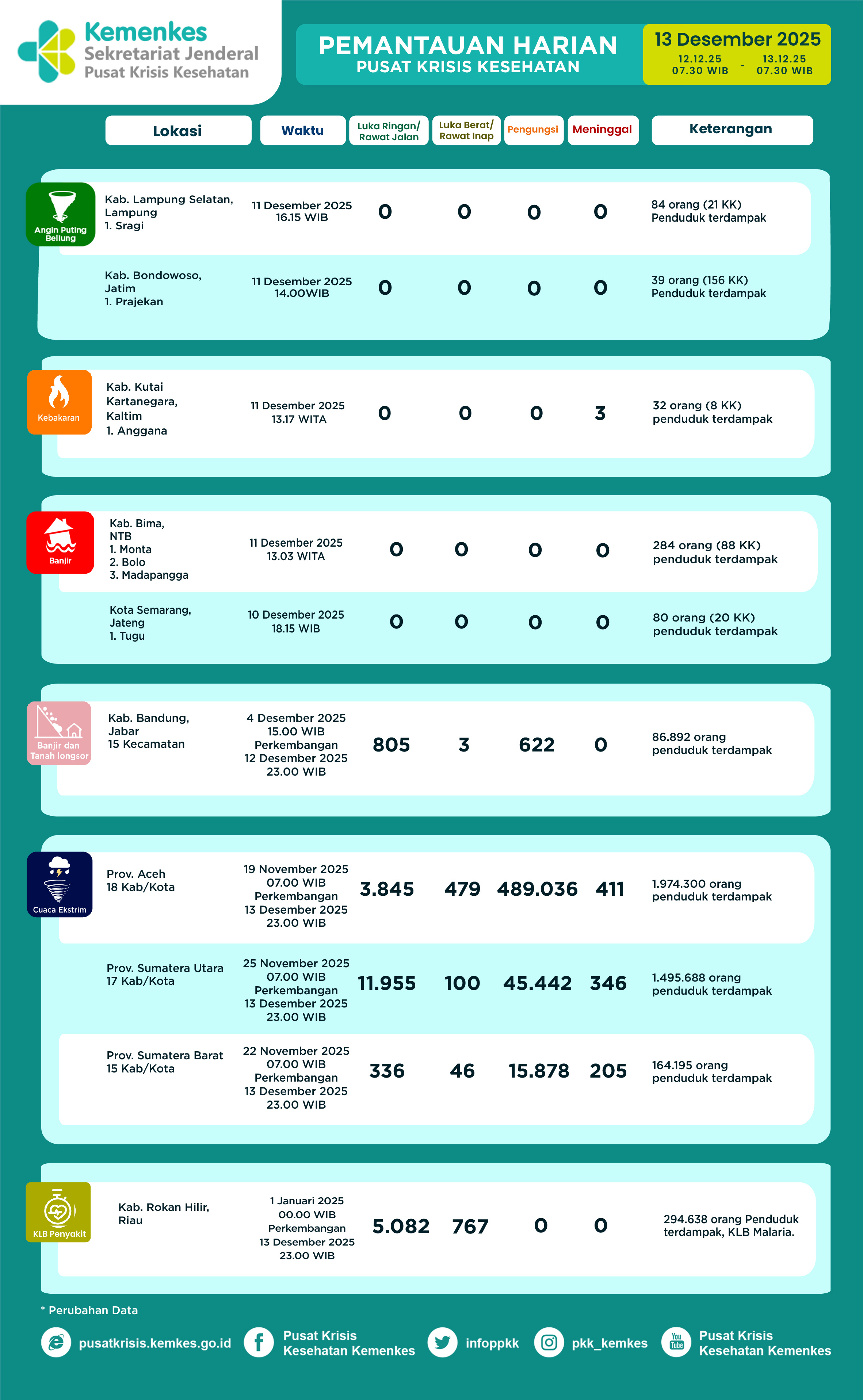Disini anda dapat mengunduh Laporan Pemantauan Harian Kejadian Krisis Kesehatan Pusat Krisis Kesehatan Kementerian Kesehatan tanggal 19 Oktober 2024 pukul 07.30 WIB hingga 20 Oktober 2024 pukul 07.30 WIB. Terdapat 12 laporan kejadian bencana: 1 Banjir dan Tanah Longsor, 1 Kebakaran, 1 Keracunan, 1 Erupsi Gunung Api, 2 Kebakaran Hutan dan Lahan, 3 Banjir, dan 3 KLB Penyakit.