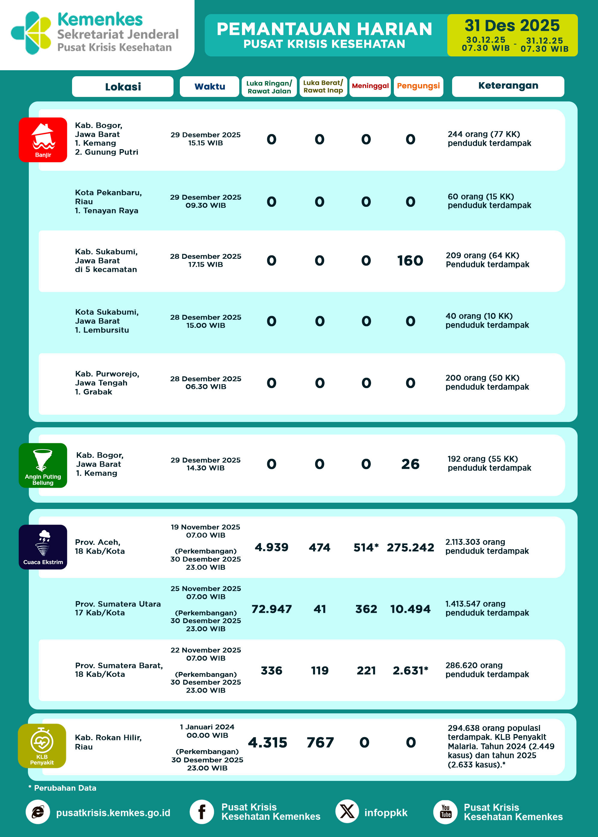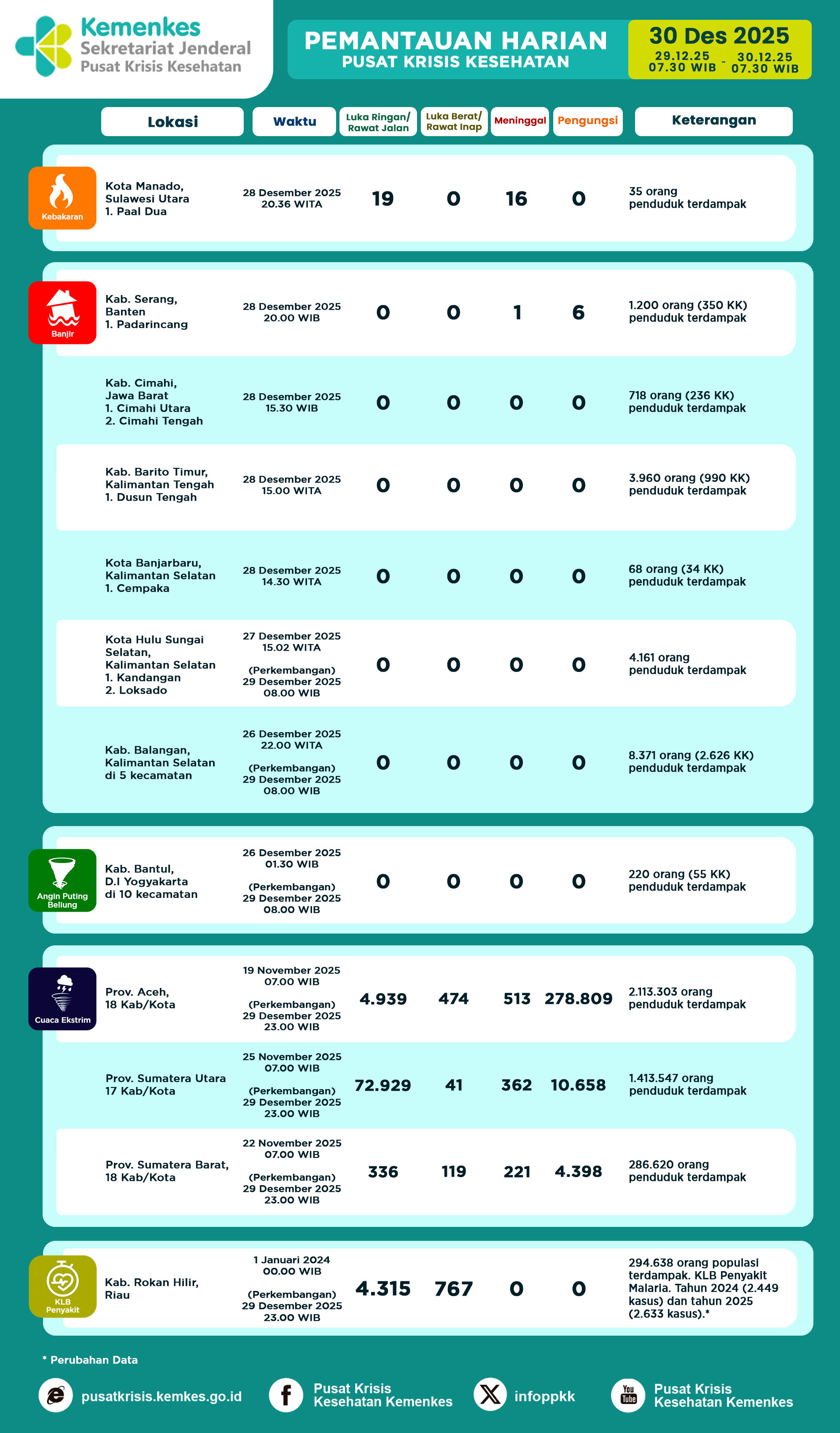 Disini anda dapat mengunduh Laporan Pemantauan Harian Kejadian Krisis Kesehatan Pusat Krisis Kesehatan Kementerian Kesehatan tanggal 20 April 2024 pukul 07.30 WIB hingga21 April 2024 pukul 07.30 WIB. Terdapat 8 laporan kejadian bencana: 4 Banjir, 1 Keracunan Makanan, 1 Banjir Bandang, 1 Banjir dan Tanah Longsor dan 1Erupsi Gunung Api.