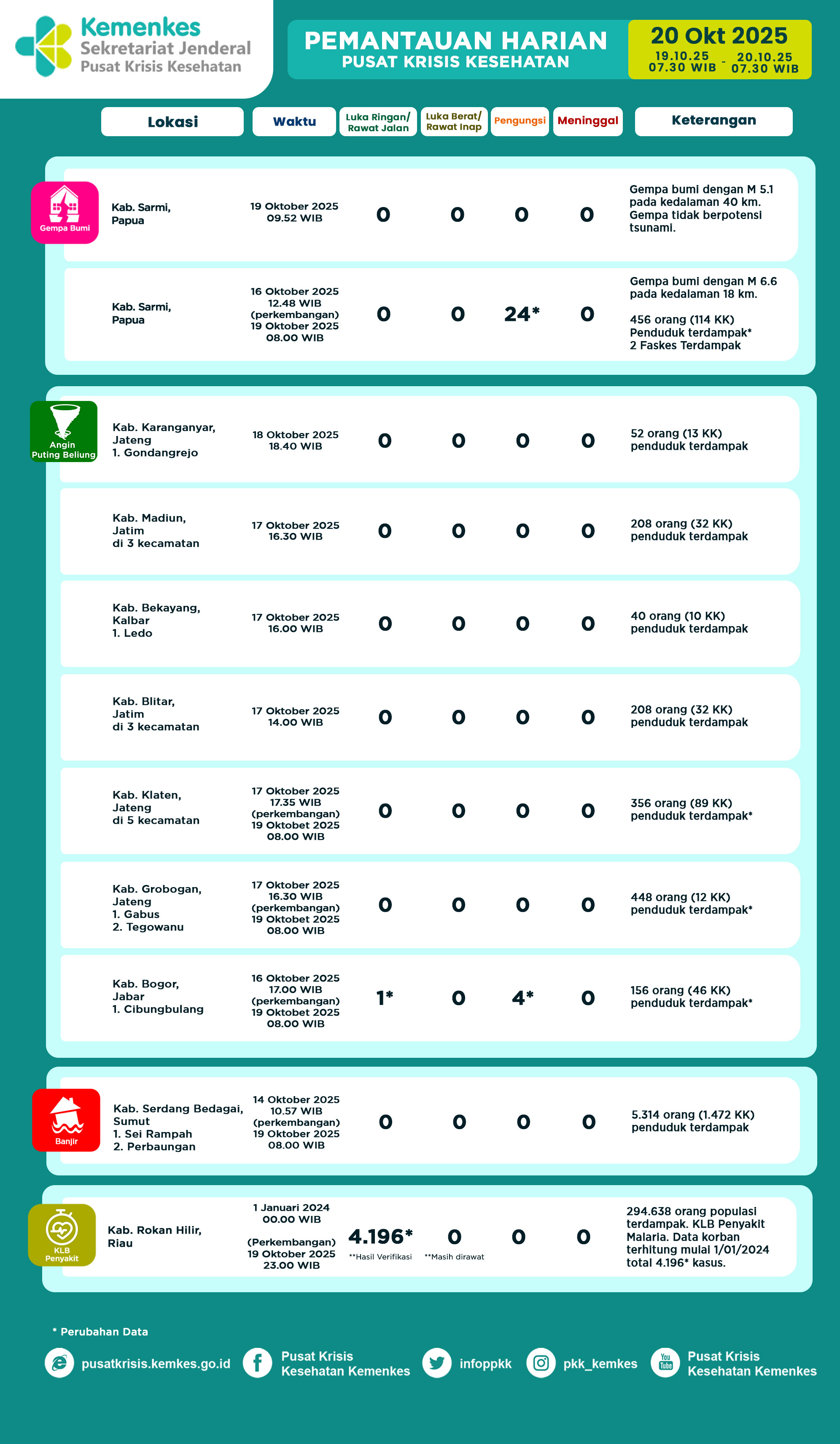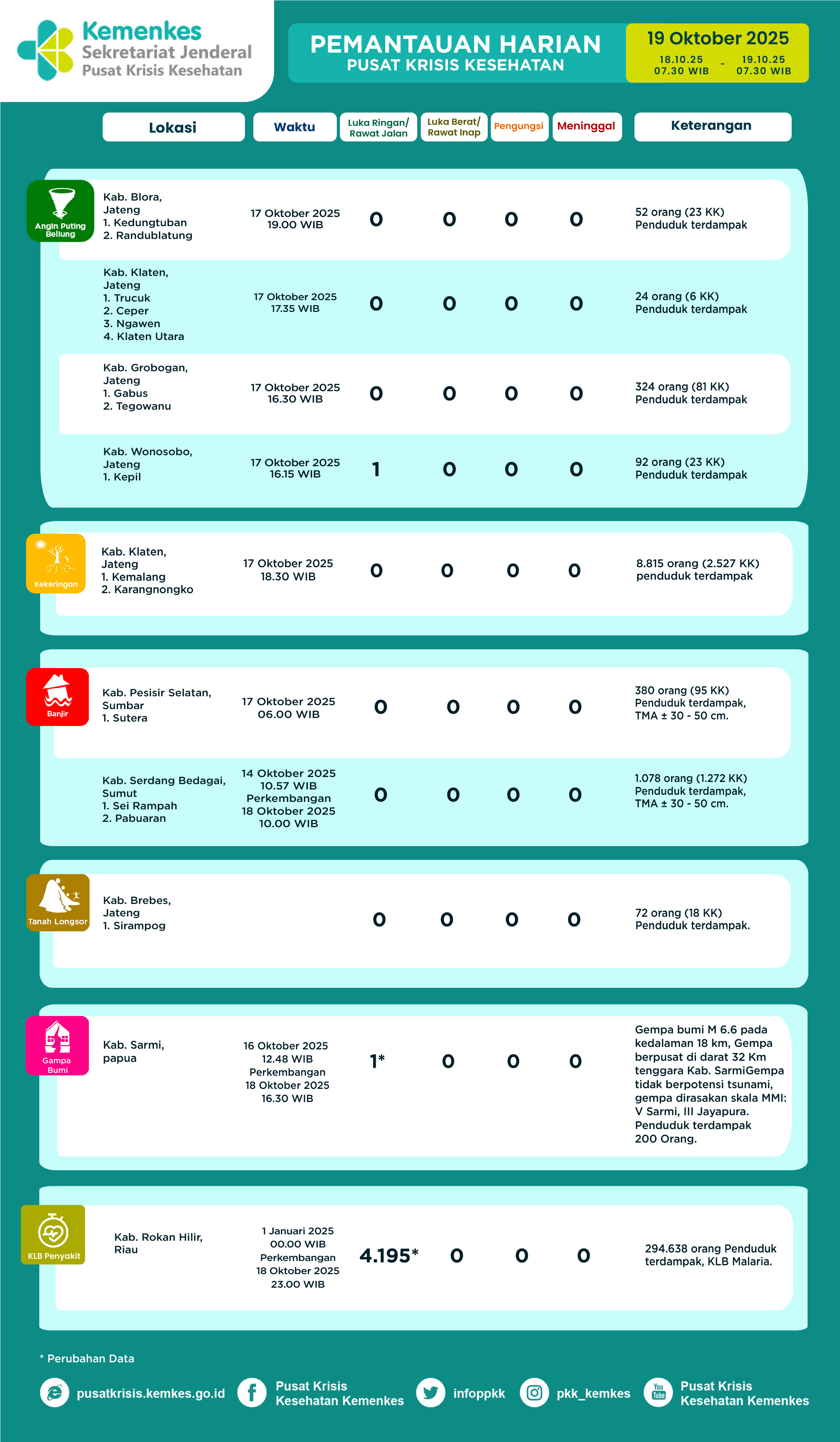 Disini anda dapat mengunduh Laporan Pemantauan Harian Kejadian Krisis Kesehatan Pusat Krisis Kesehatan Kementerian Kesehatan tanggal 20 Januari 2024 pukul 07.30 WIB hingga 21 Januari 2024 pukul 07.30 WIB. Terdapat 11 kejadian bencana: 3 Angin Puting Beliung, 4 Banjir, 2 Kegagalan Teknologi, 1 Banjir dan Tanah Longsor, 1 Erupsi Gunung Berapi.