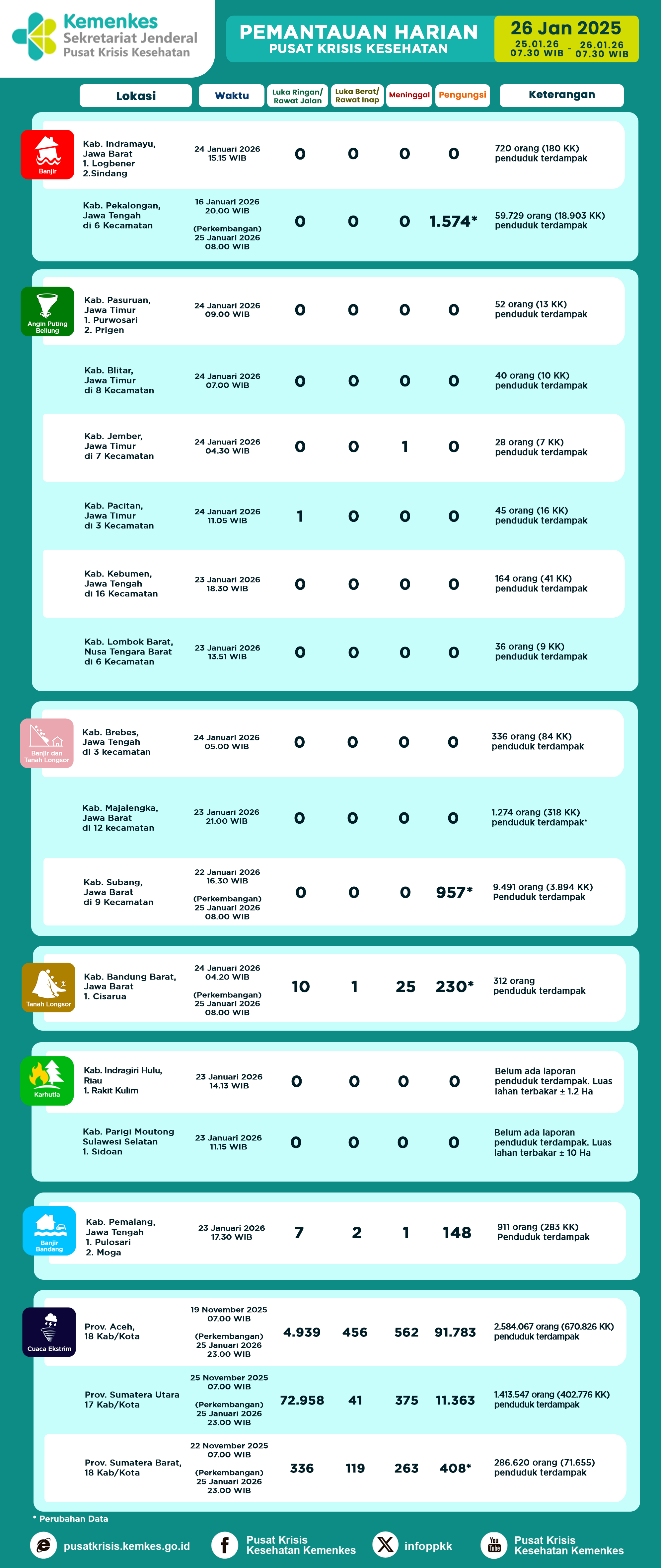 Di sini anda dapat melihat dan mengunduh laporan Pemantauan Harian Pusat Krisis Kesehatan Kementerian Kesehatan Tanggal 21 Januari 2026 pukul 07.30 WIB hingga 22 Januari 2026 pukul 07.30 WIB