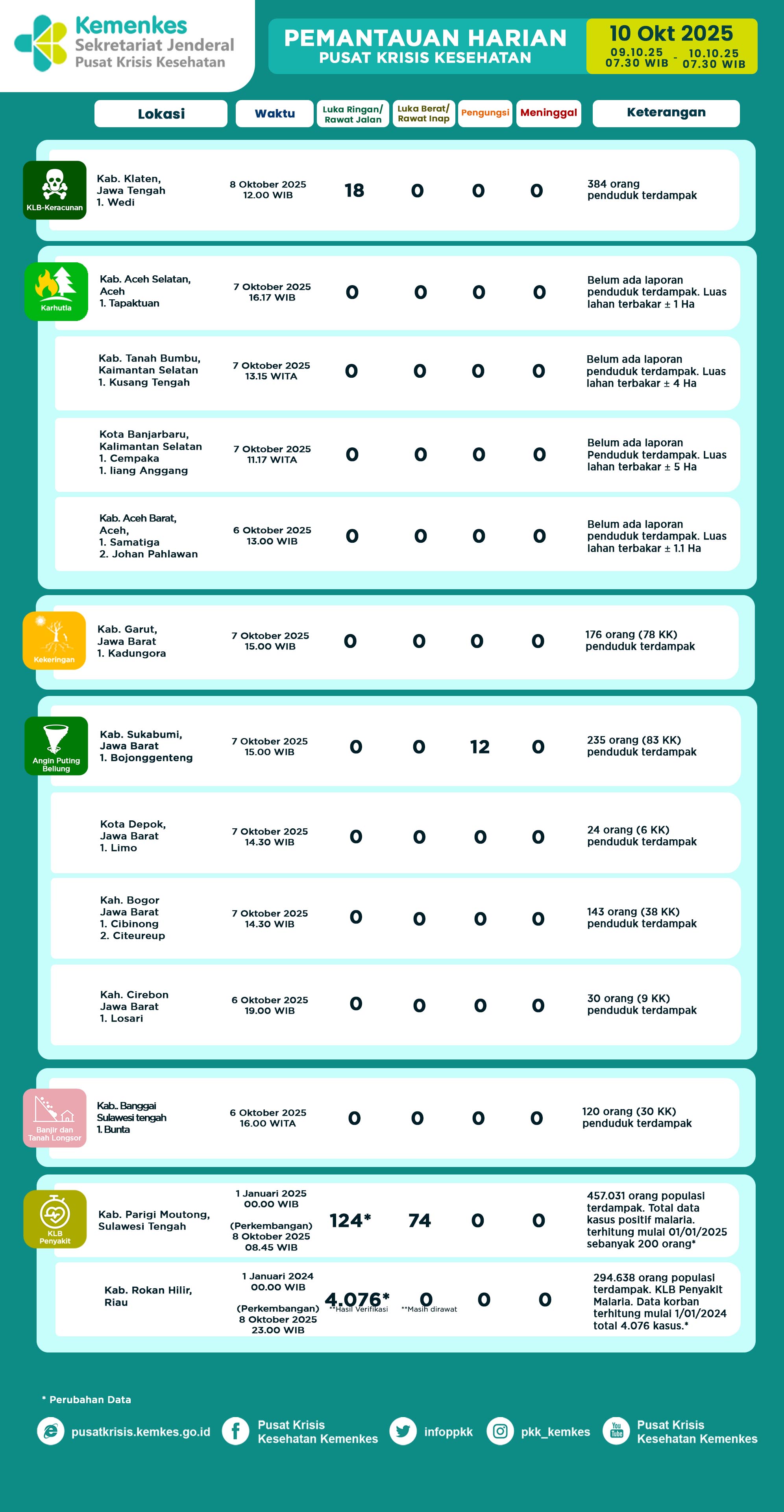 Di sini anda dapat melihat dan mengunduh laporan Pemantauan Harian Pusat Krisis Kesehatan Kementerian Kesehatan Tanggal 22 Agustus 2025 pukul 07.30 WIB hingga 23 Agustus 2025 pukul 07.30 WIB