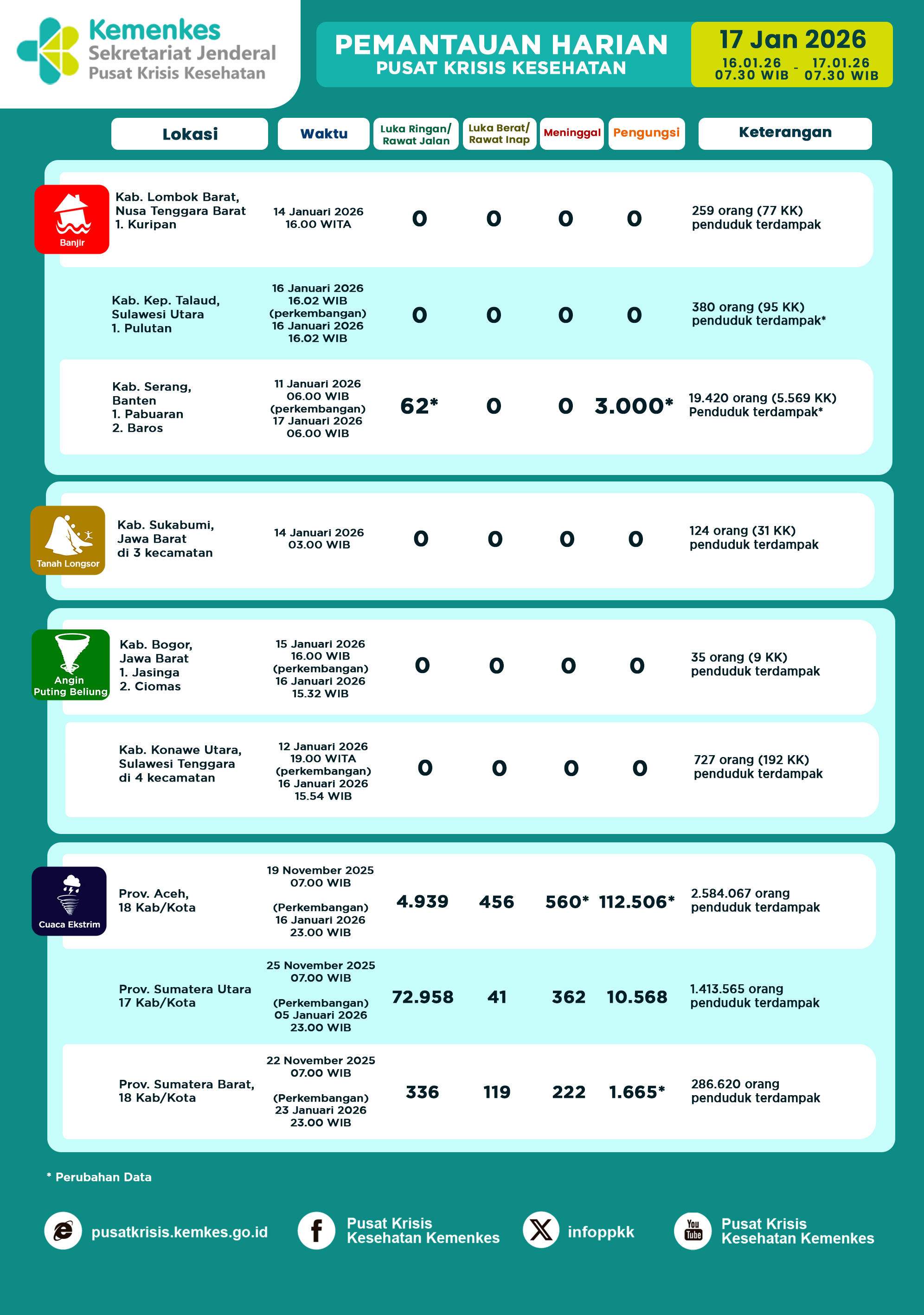 Disini anda dapat mengunduh Laporan Pemantauan Harian Kejadian Krisis Kesehatan Pusat Krisis Kesehatan Kementerian Kesehatan tanggal 23 April 2024 pukul 07.30 WIB hingga 24 April 2024 pukul 07.30 WIB. Terdapat 10 laporan kejadian bencana: 2 Angin Puting Beliung, 4 Banjir, 1 Erupsi Gunung, 2 Banjir dan Tanah Longsor, dan 1 Tanah Longsor