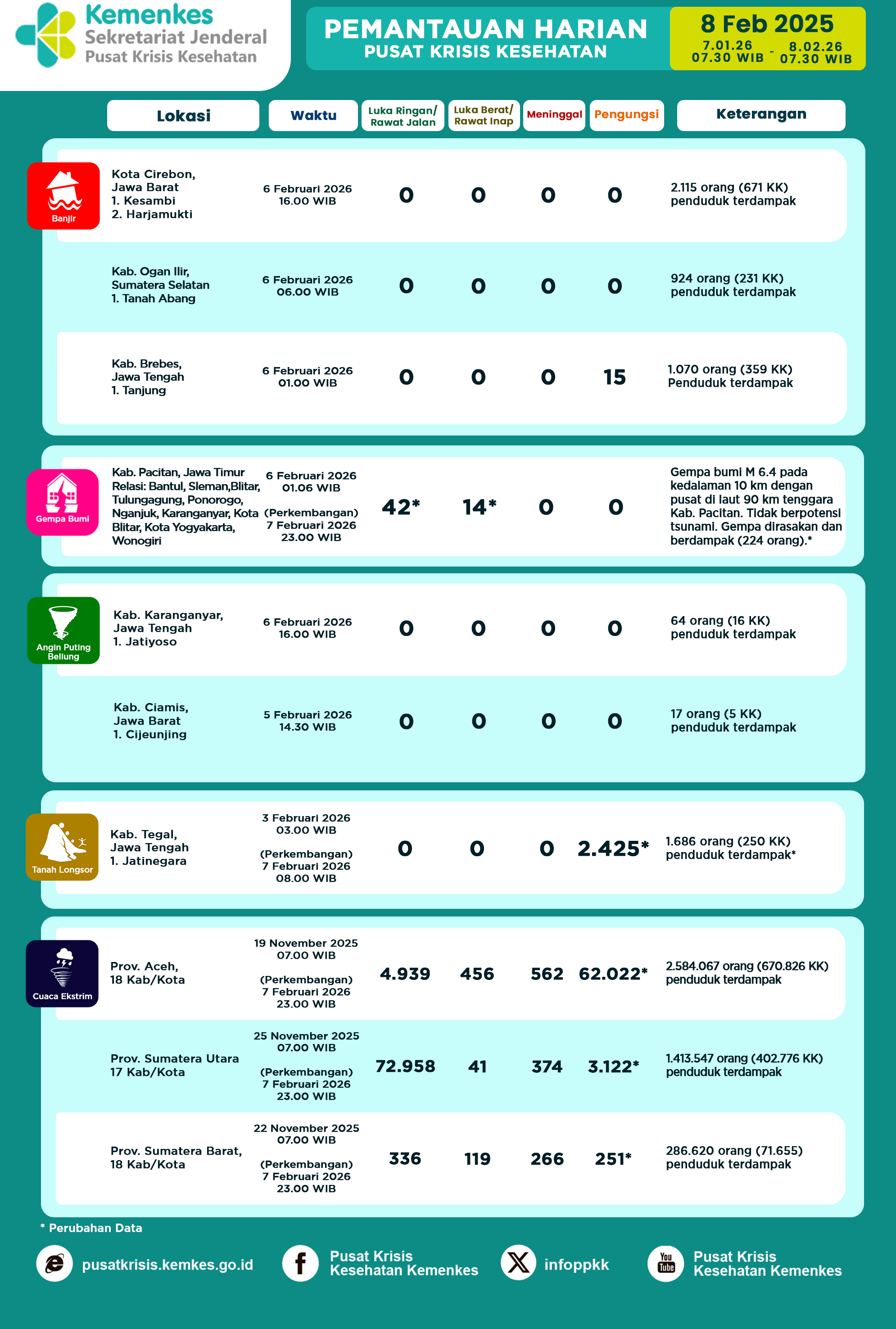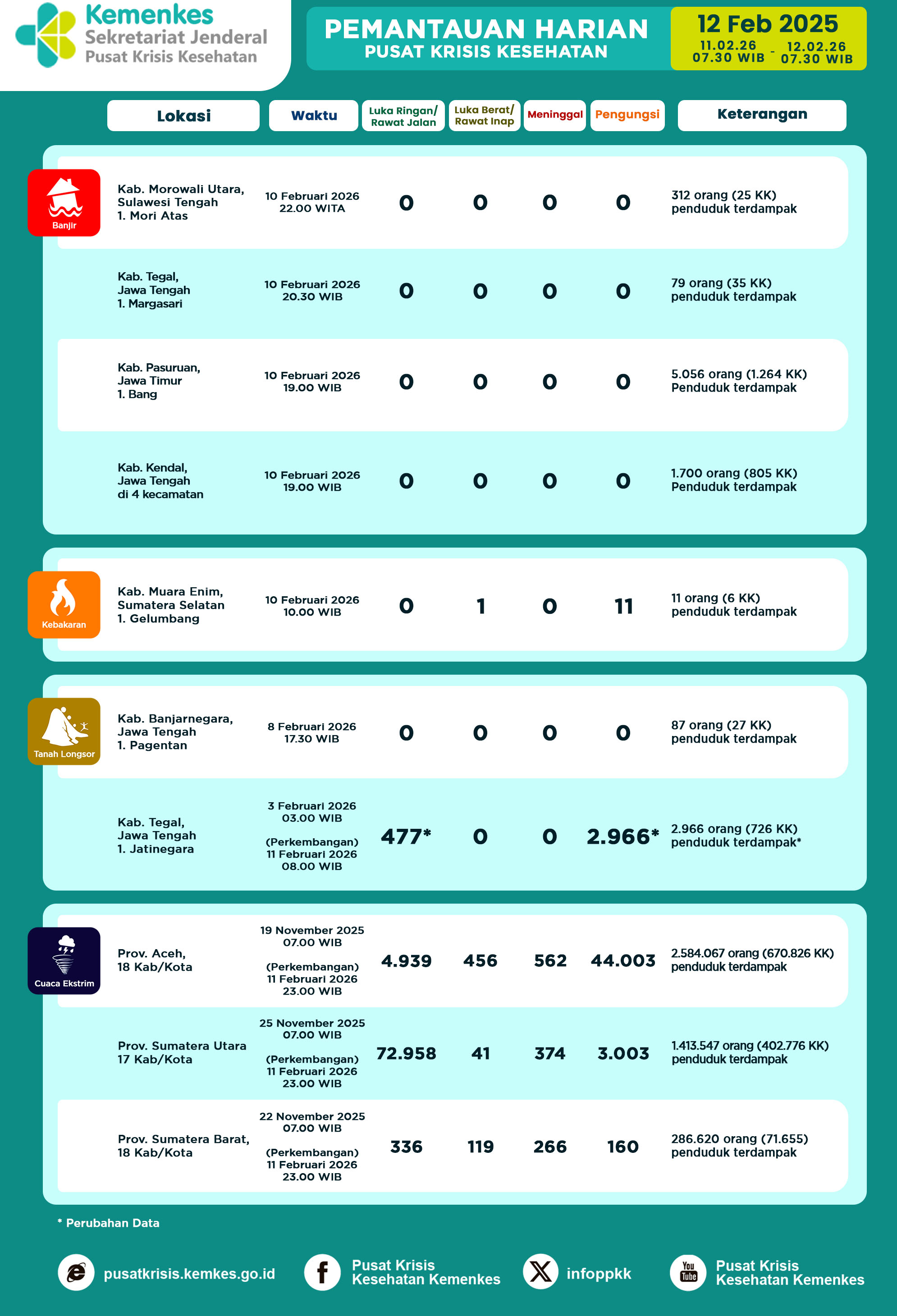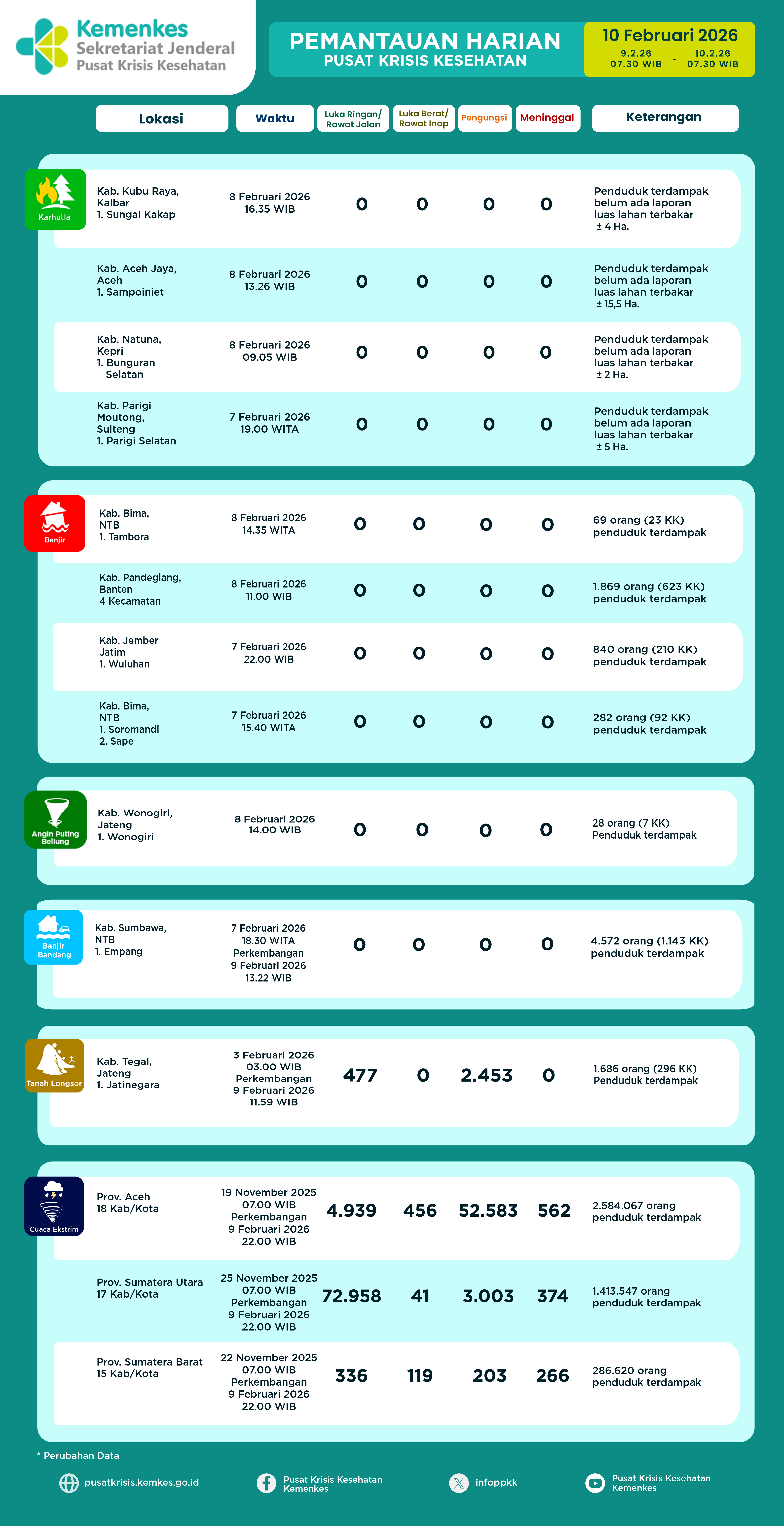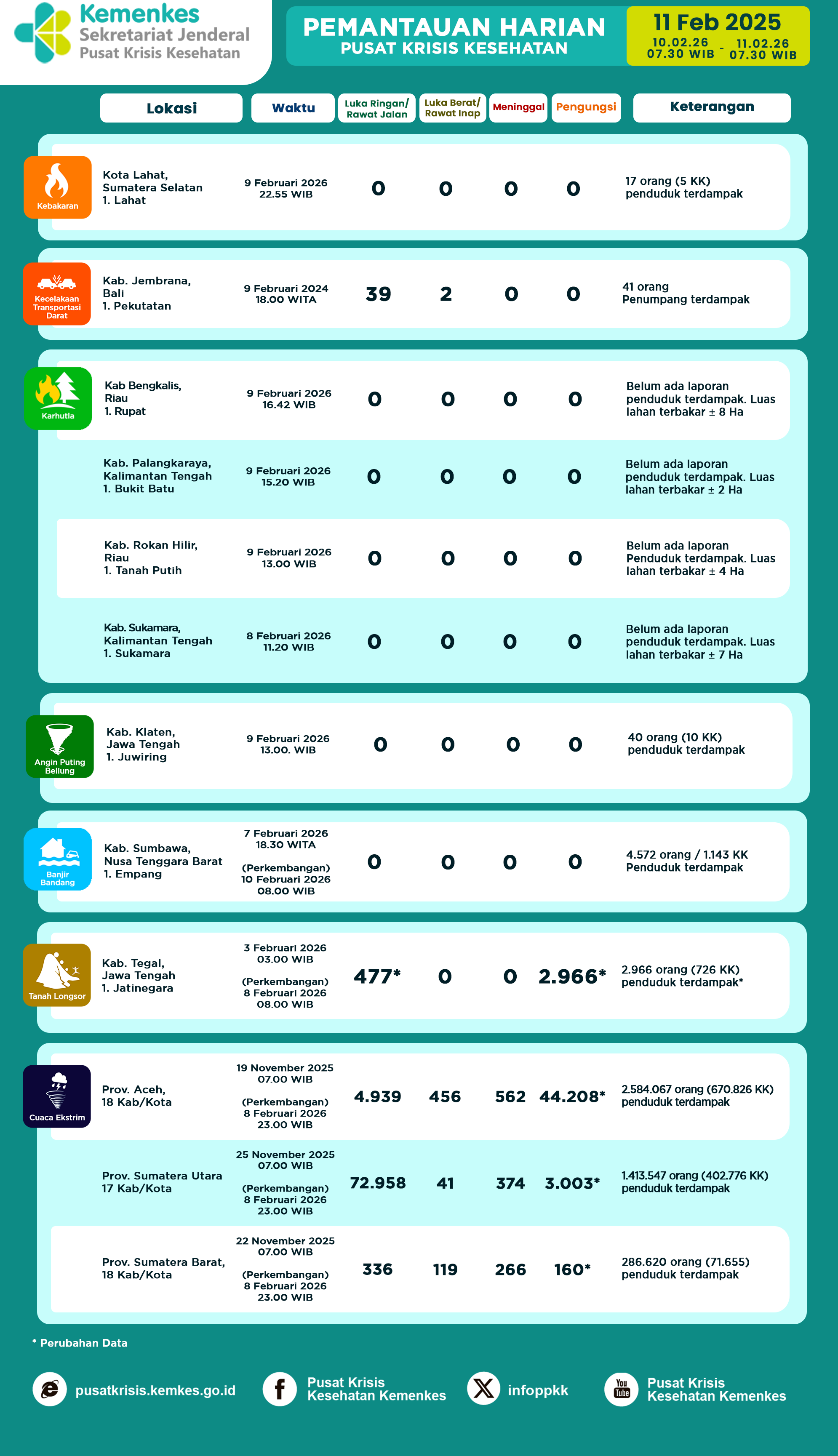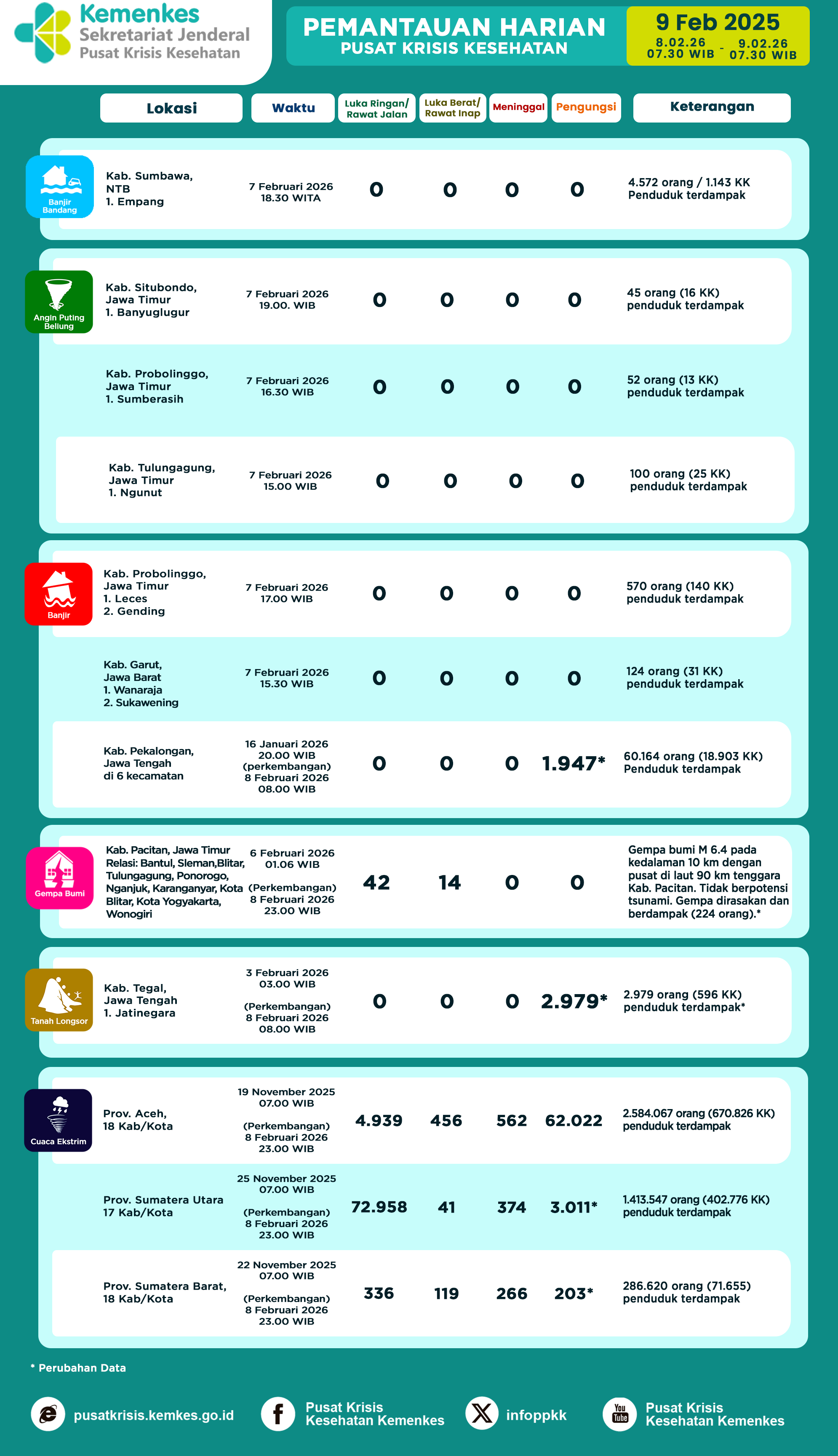 Di sini anda dapat melihat dan mengunduh laporan Pemantauan Harian Pusat Krisis Kesehatan Kementerian Kesehatan Tanggal 23 September 2025 pukul 07.30 WIB hingga 24 September 2025 pukul 07.30 WIB