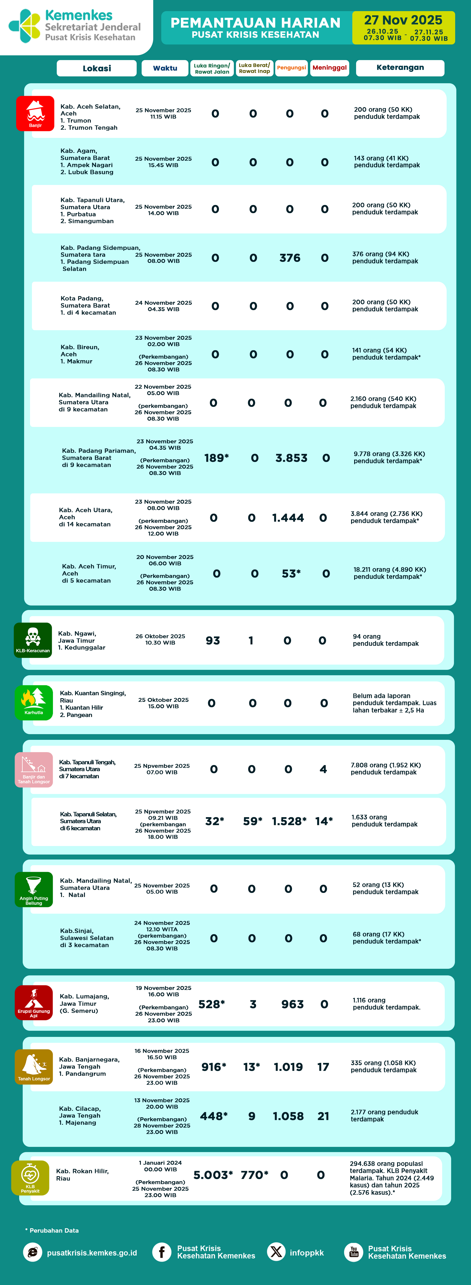 Disini anda dapat melihat dan mengunduh Laporan Pemantauan Harian Kejadian Krisis Kesehatan Pusat Krisis Kesehatan Kementerian Kesehatan tanggal 25 April 2025 pukul 07.30 WIB hingga 26 April 2025 pukul 07.30 WIB.