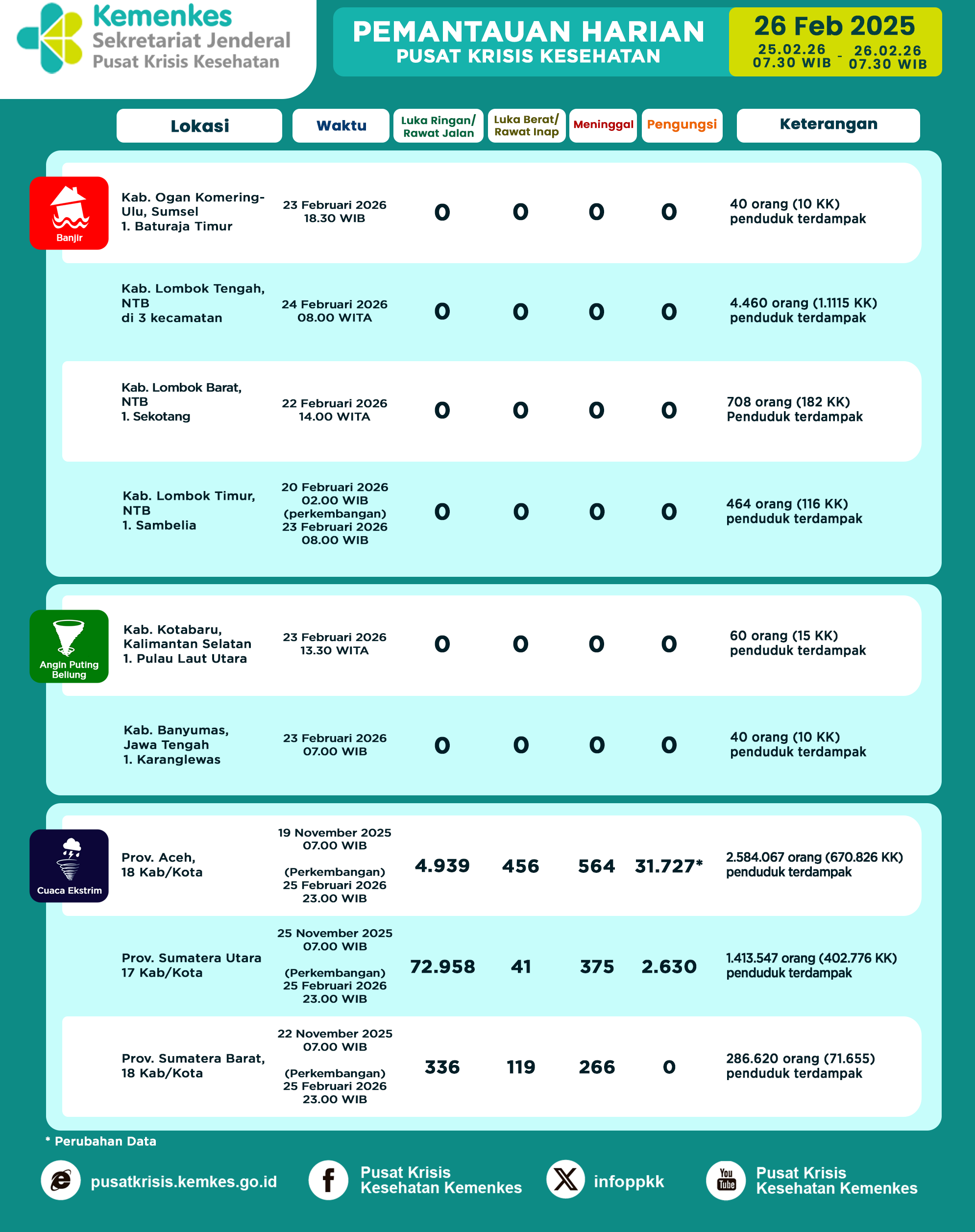 Di sini anda dapat melihat dan mengunduh laporan Pemantauan Harian Pusat Krisis Kesehatan Kementerian Kesehatan Tanggal 26 Juli 2025 pukul 07.30 WIB hingga 27 Juli 2025 pukul 07.30 WIB