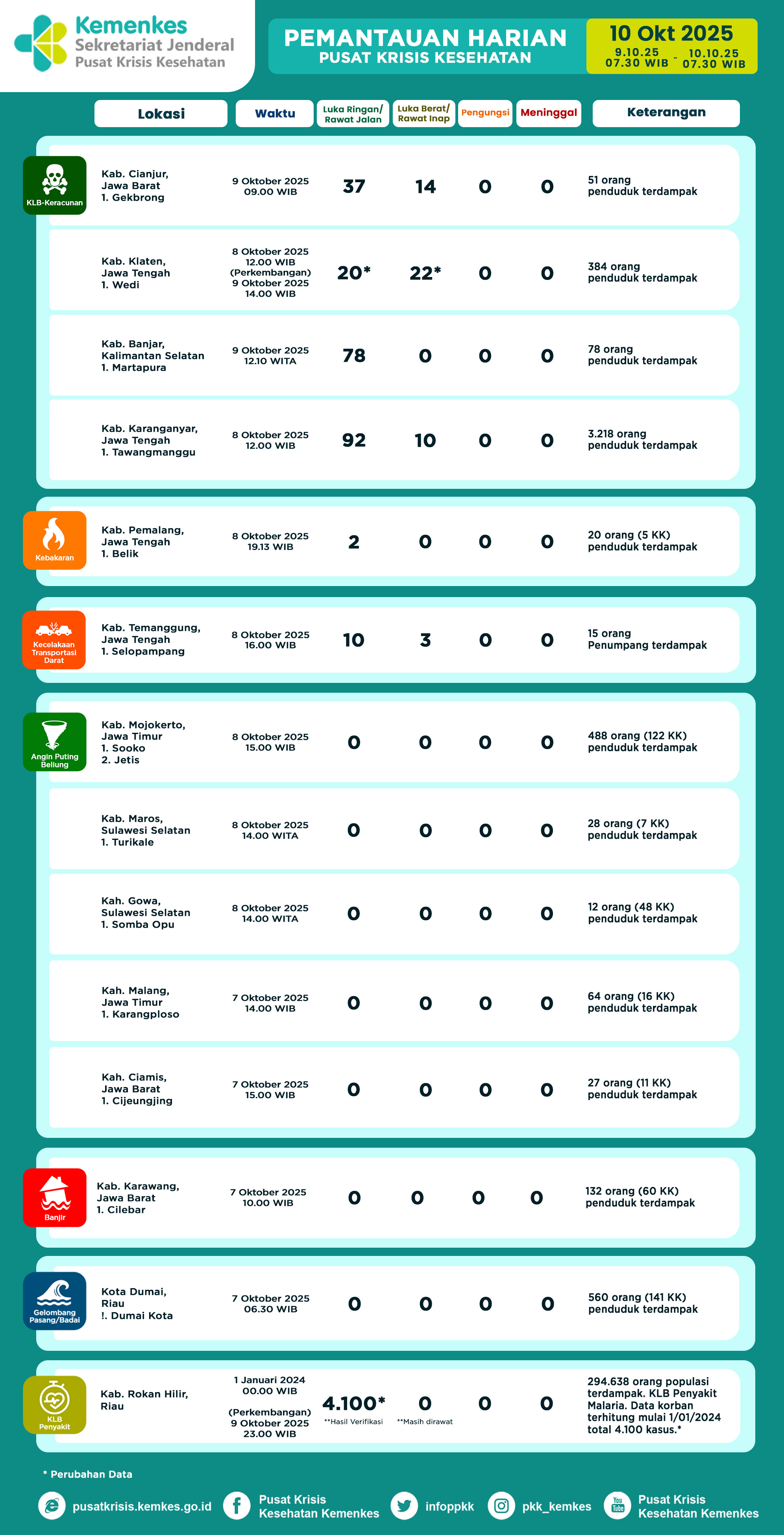 Disini anda dapat mengunduh Laporan Pemantauan Harian Kejadian Krisis Kesehatan Pusat Krisis Kesehatan Kementerian Kesehatan tanggal 28 November 2023 pukul 07.30 WIB. Terdapat 10 laporan kejadian: 1 Kebakaran, 7 Banjir, 1 Angin Puting Beliung dan 1 Erupsi Gunung Api