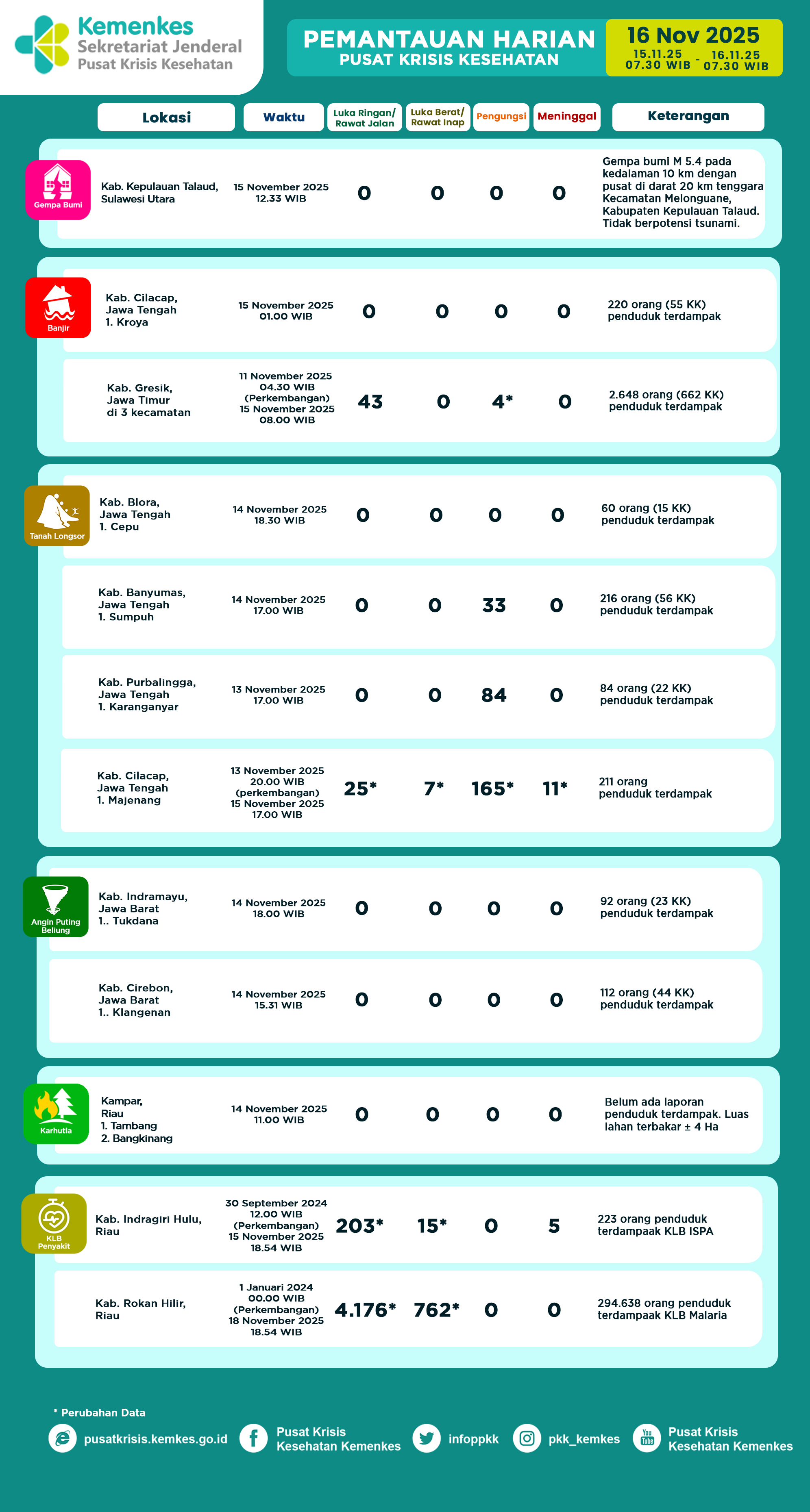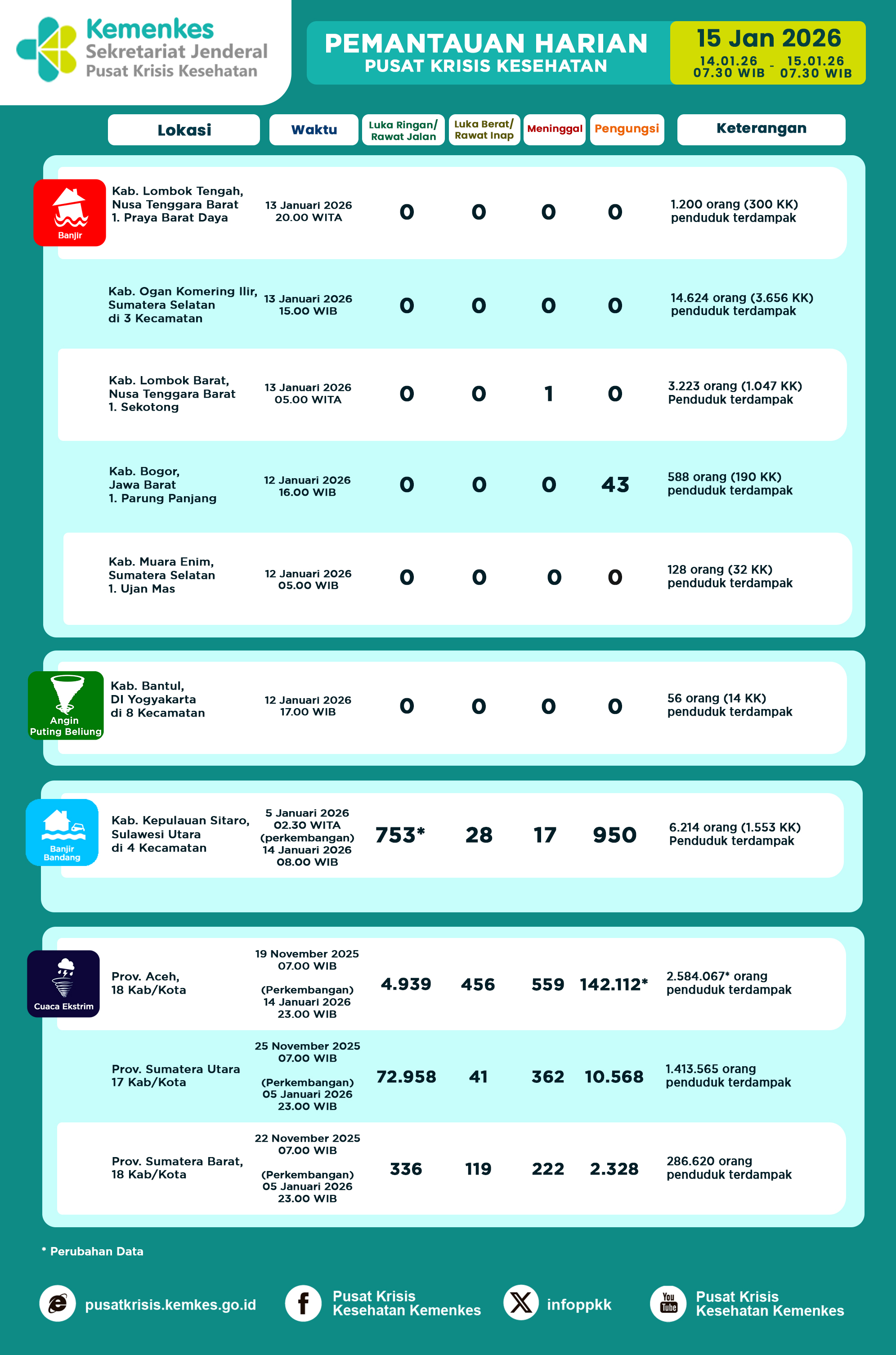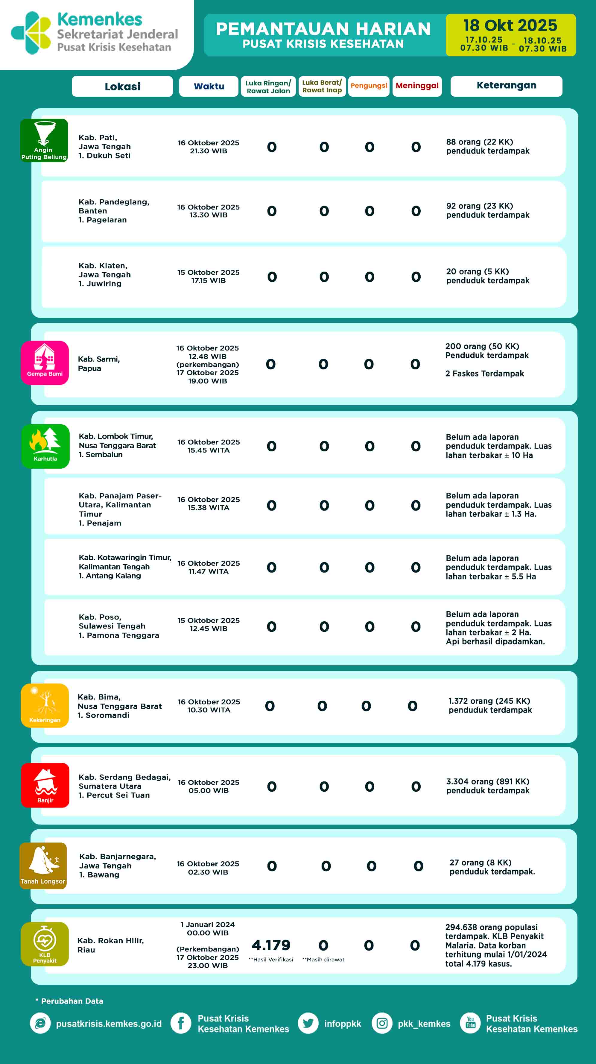 Disini anda dapat mengunduh Laporan Pemantauan Harian Kejadian Krisis Kesehatan Pusat Krisis Kesehatan Kementerian Kesehatan tanggal 28 Maret 2024 pukul 07.30 WIB hingga 29 Maret 2024 pukul 07.30 WIB. Terdapat 11 laporan kejadian bencana: 2 Gempa Bumi, 2 Banjir dan Tanah Longsor, 3 Banjir, 1 Kebakaran dan 3 Angin Puting Beliung.