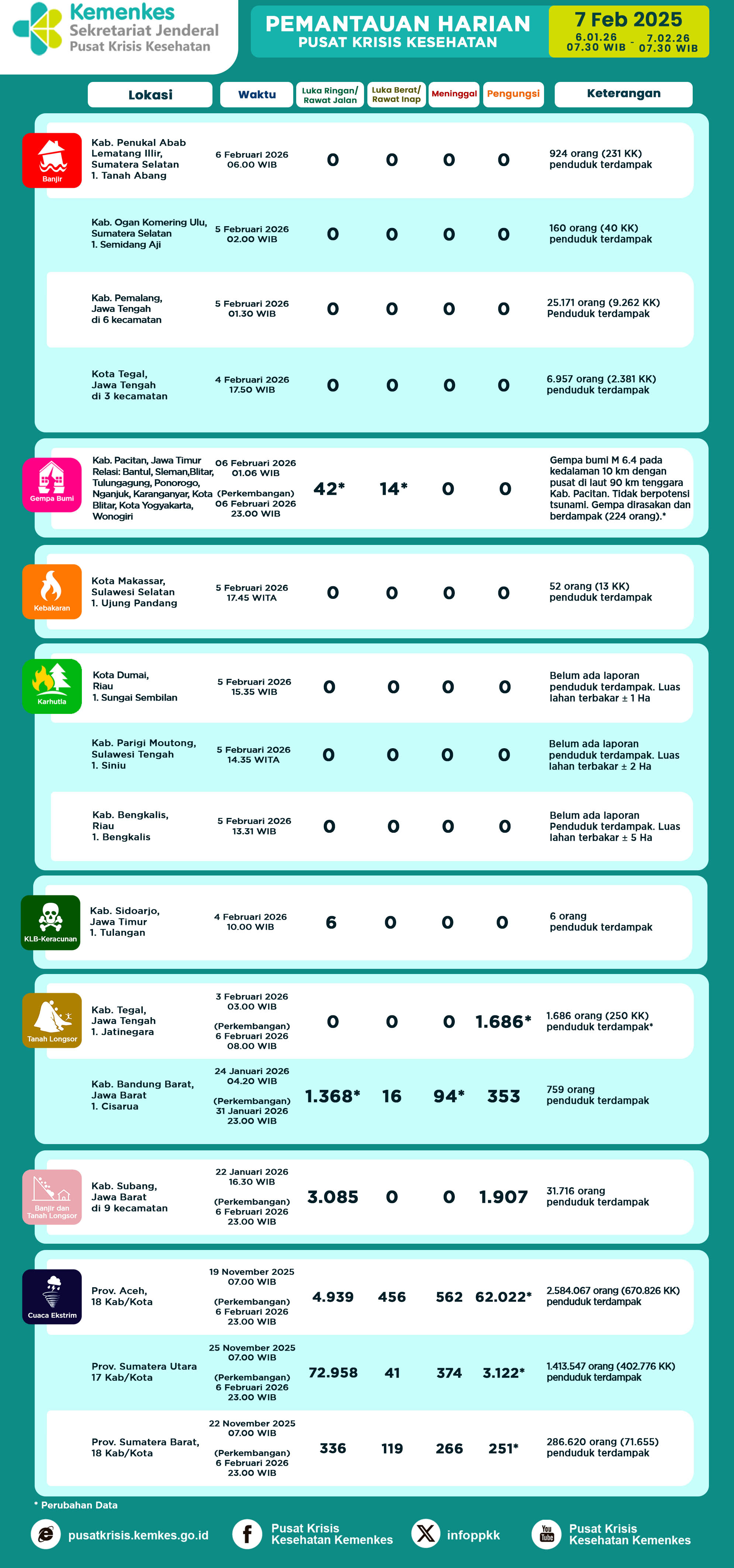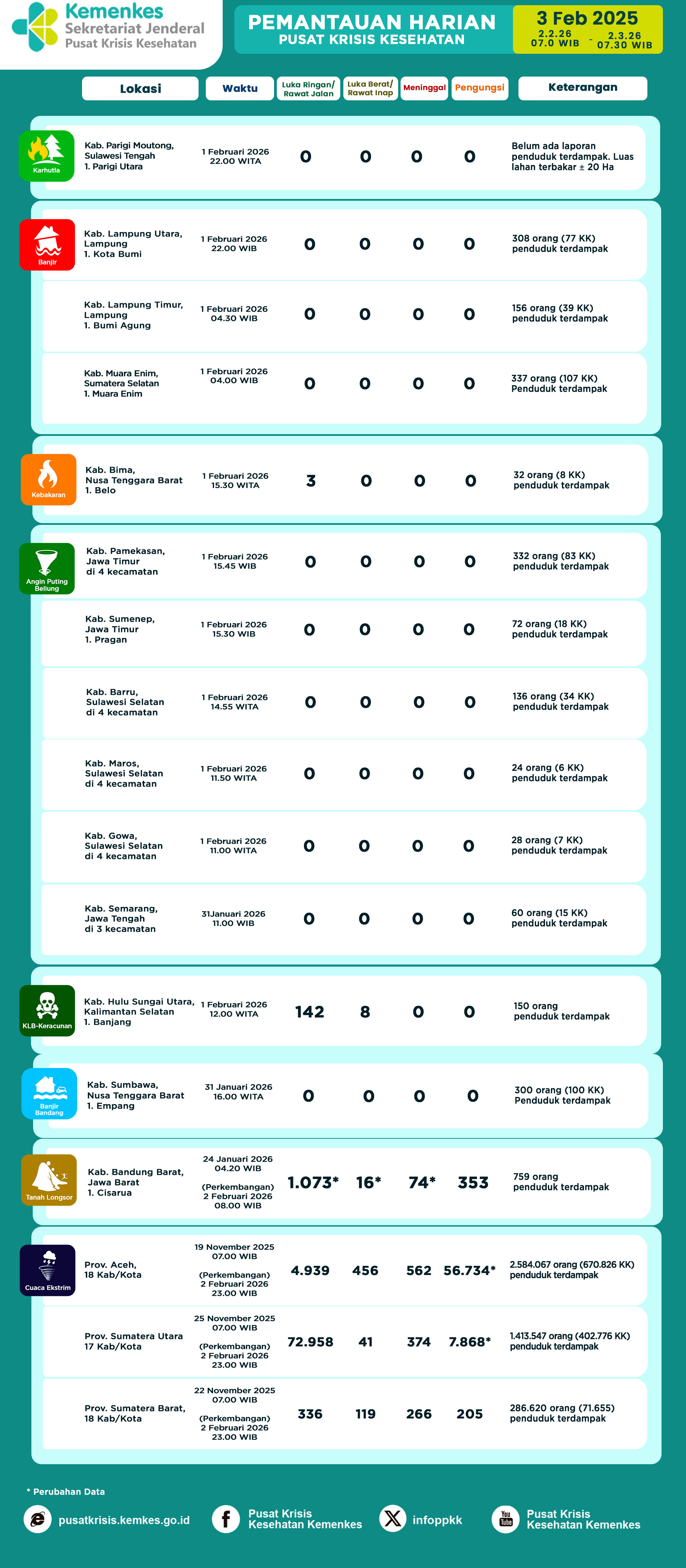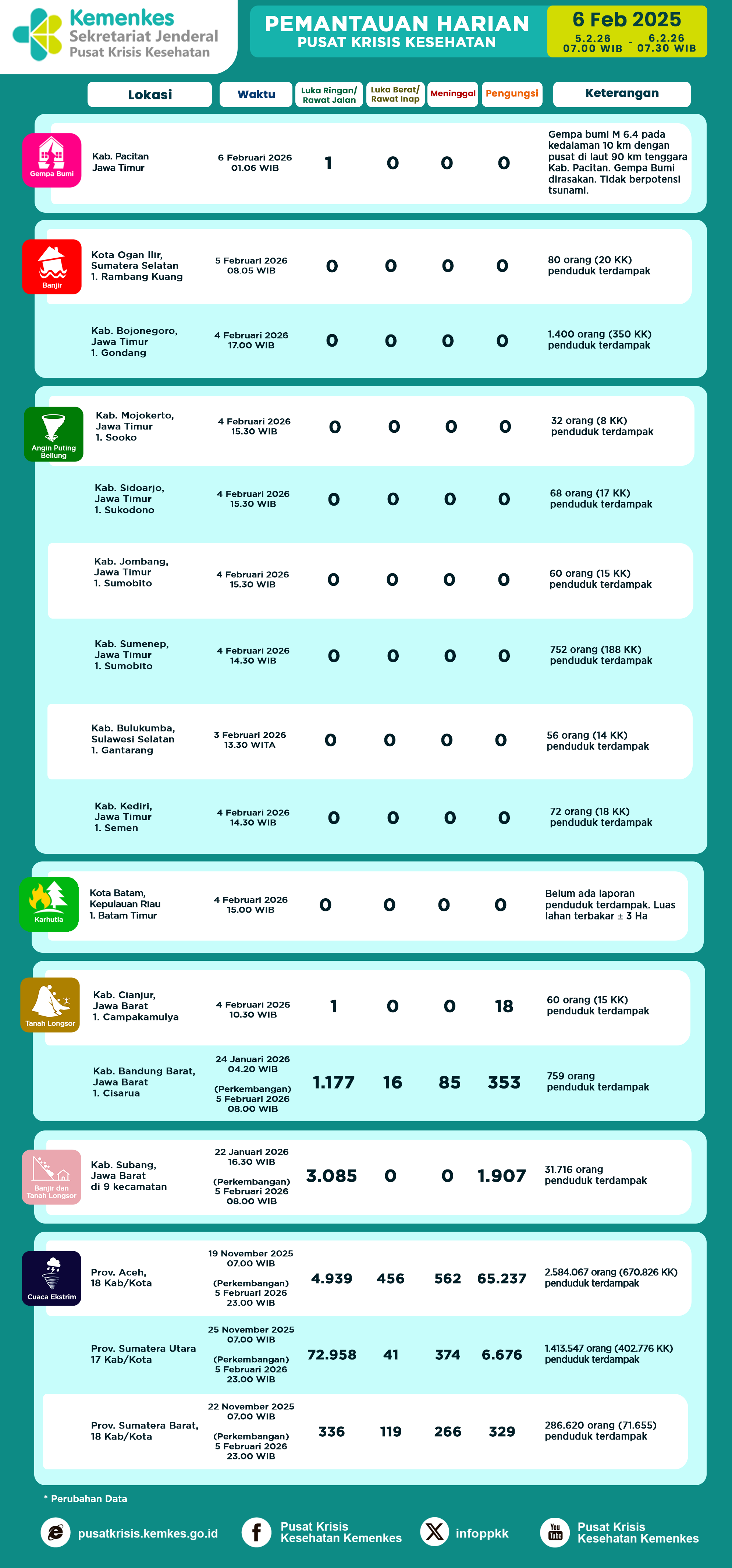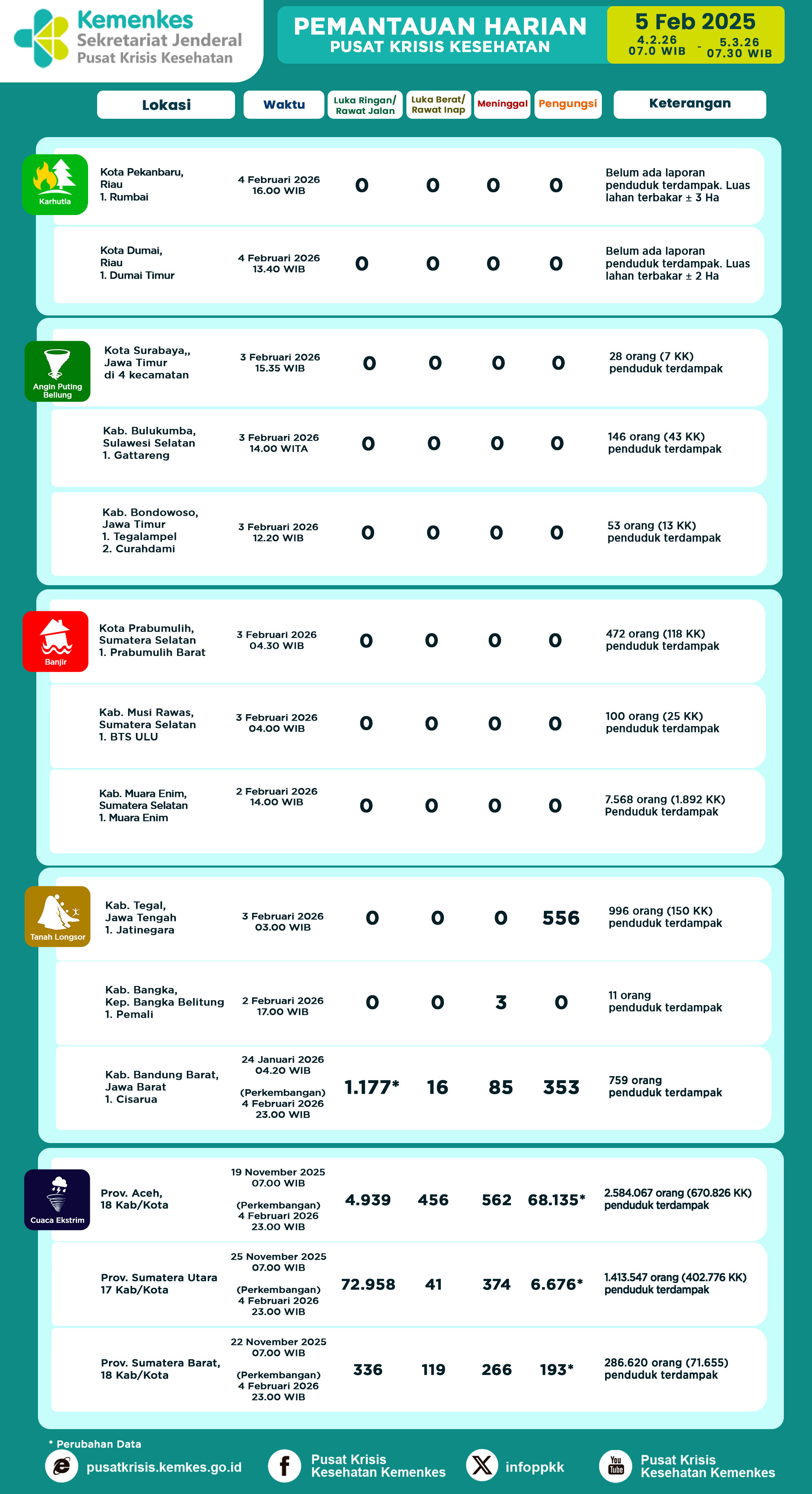 Di sini anda dapat melihat dan mengunduh laporan Pemantauan Harian Pusat Krisis Kesehatan Kementerian Kesehatan Tanggal 30 Agustus 2025 pukul 07.30 WIB hingga 31 Agustus 2025 pukul 07.30 WIB