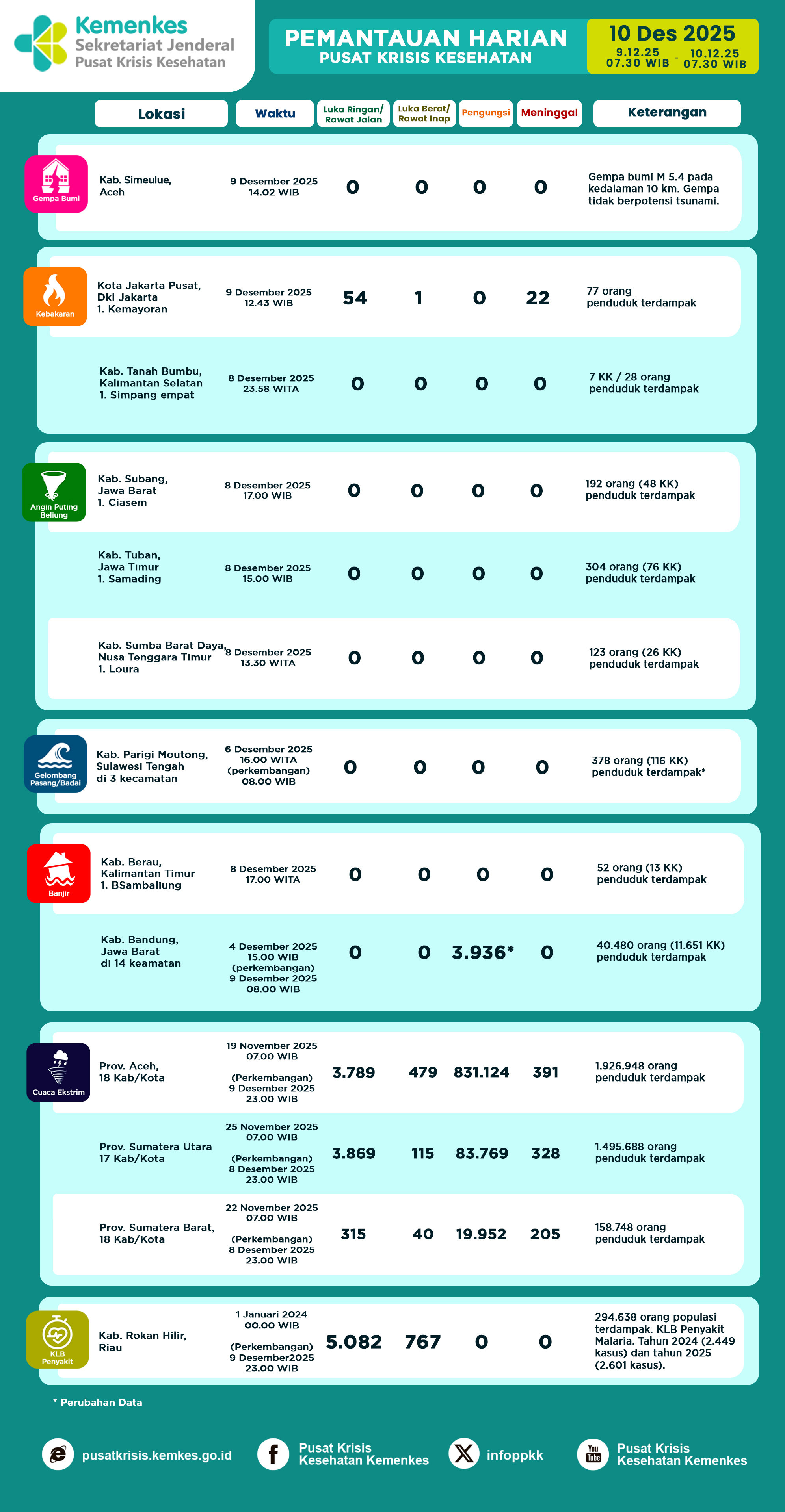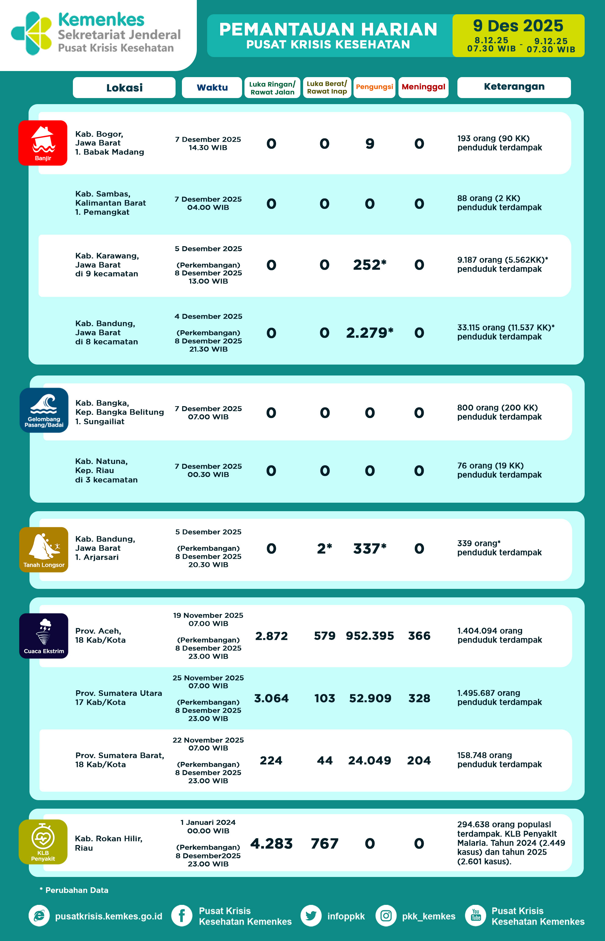 Di sini anda dapat melihat dan mengunduh laporan Pemantauan Harian Pusat Krisis Kesehatan Kementerian Kesehatan Tanggal 7 Desember 2025 pukul 07.30 WIB hingga 8 Desember 2025 pukul 07.30 WIB