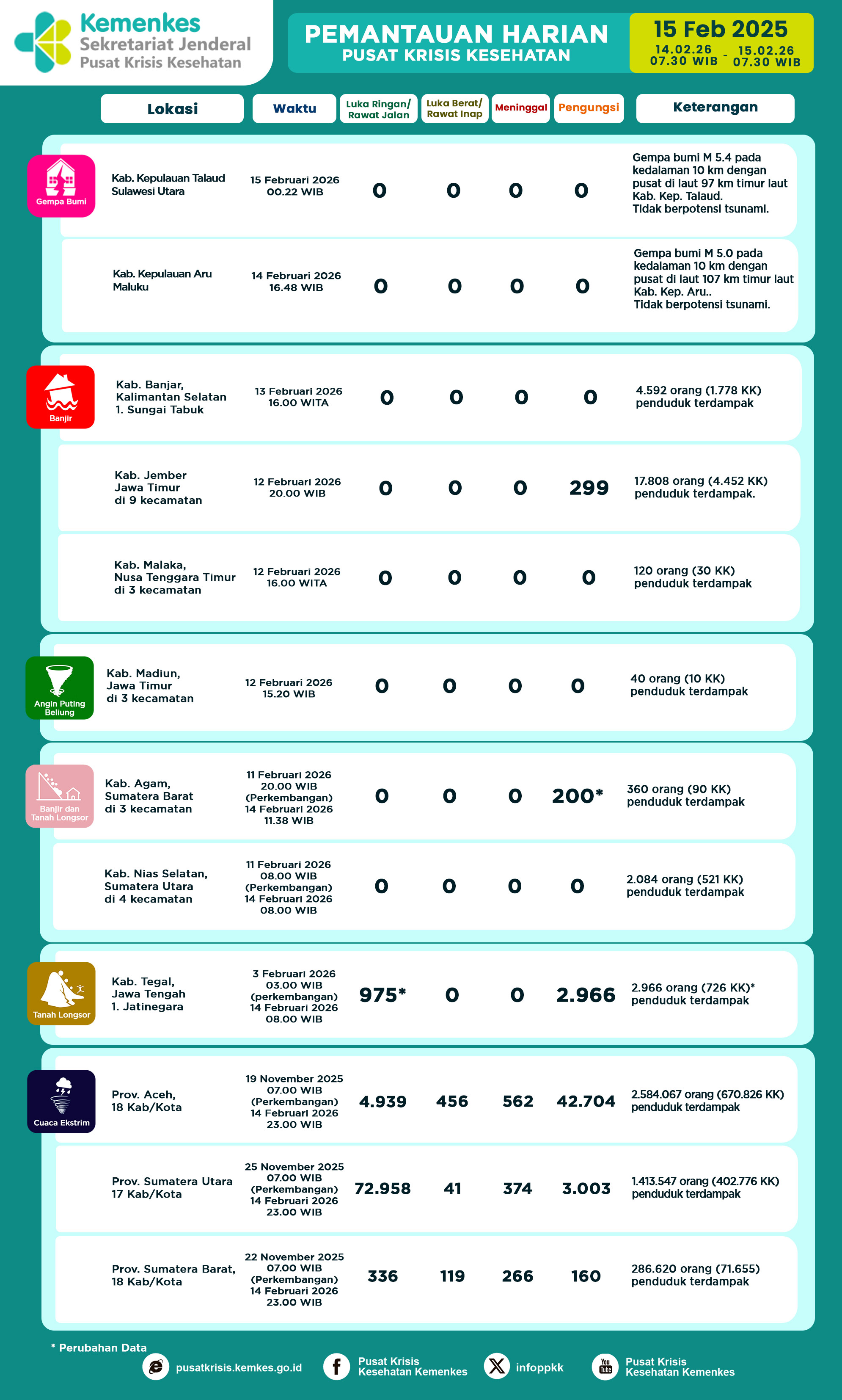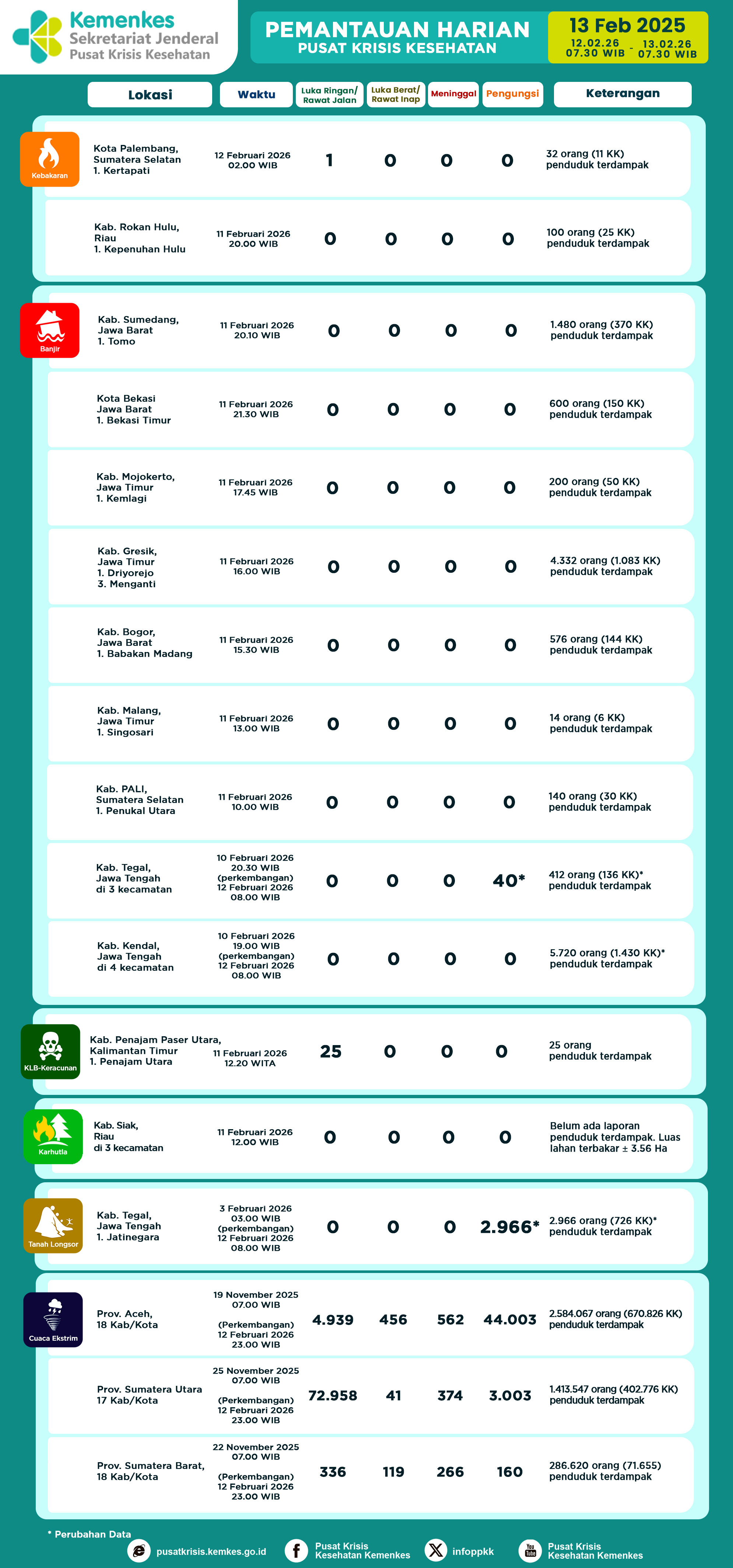 Di sini anda dapat melihat dan mengunduh laporan Pemantauan Harian Pusat Krisis Kesehatan Kementerian Kesehatan Tanggal 7 November 2025 pukul 07.30 WIB hingga 8 November 2025 pukul 07.30 WIB