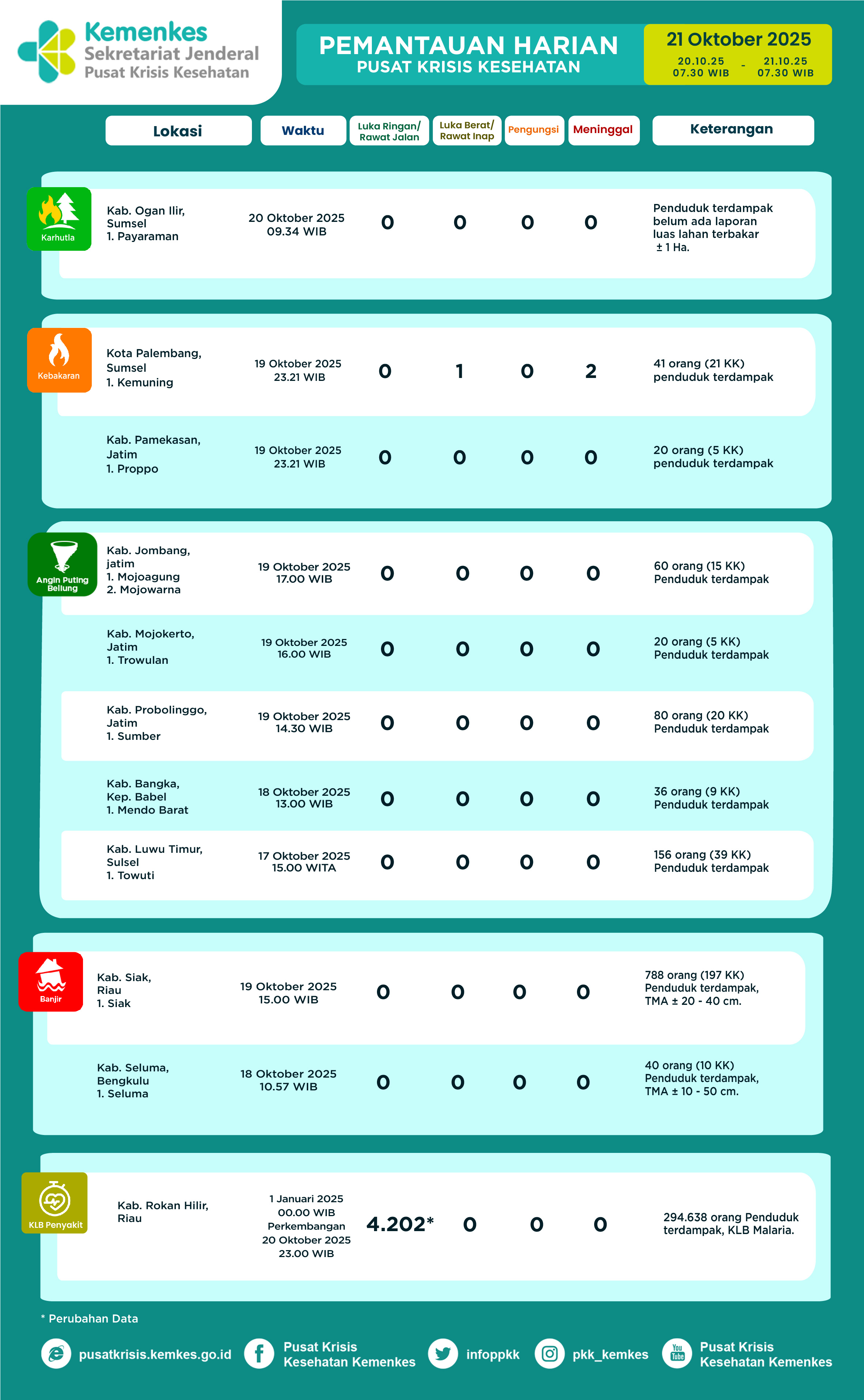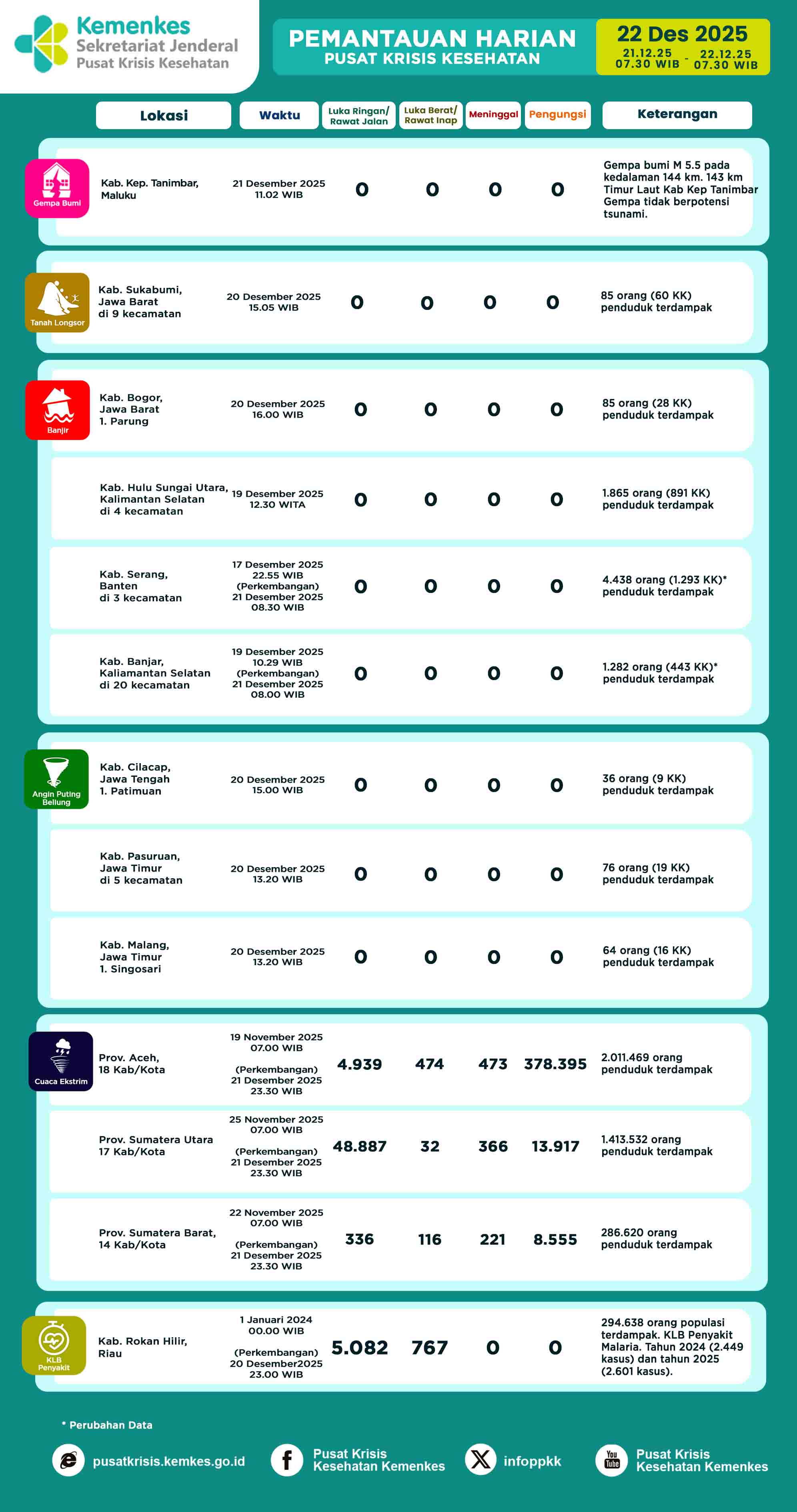 Disini anda dapat mengunduh Laporan Pemantauan Harian Kejadian Krisis Kesehatan Pusat Krisis Kesehatan Kementerian Kesehatan tanggal 09 Maret 2024 pukul 07.30 WIB hingga 10 Maret 2024 pukul 07.30 WIB. Terdapat 15 kejadian bencana: 11 Banjir, 2 Angin Puting Beliung, 1 Banjir dan Tanah Longsor dan 1 KLB Penyakit.